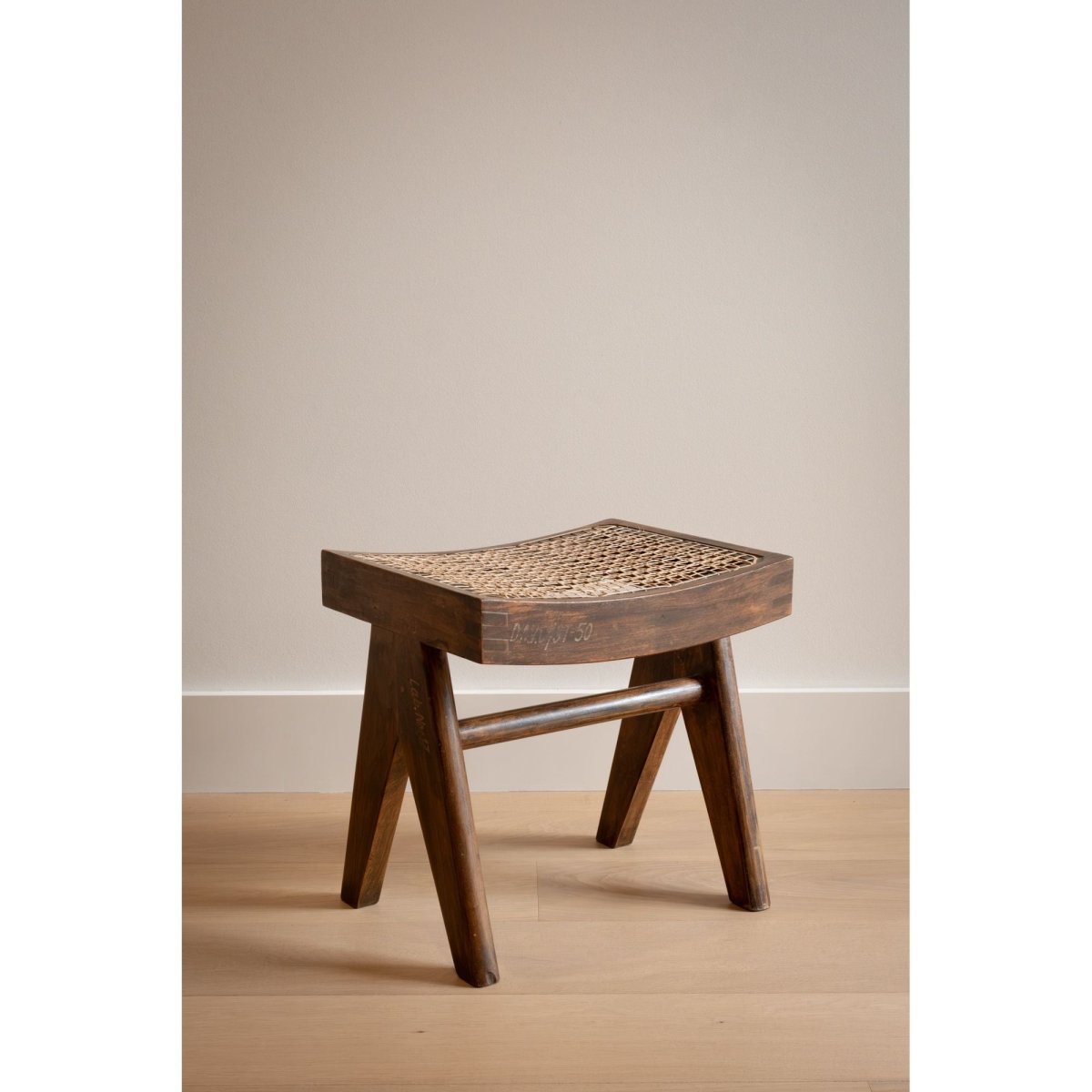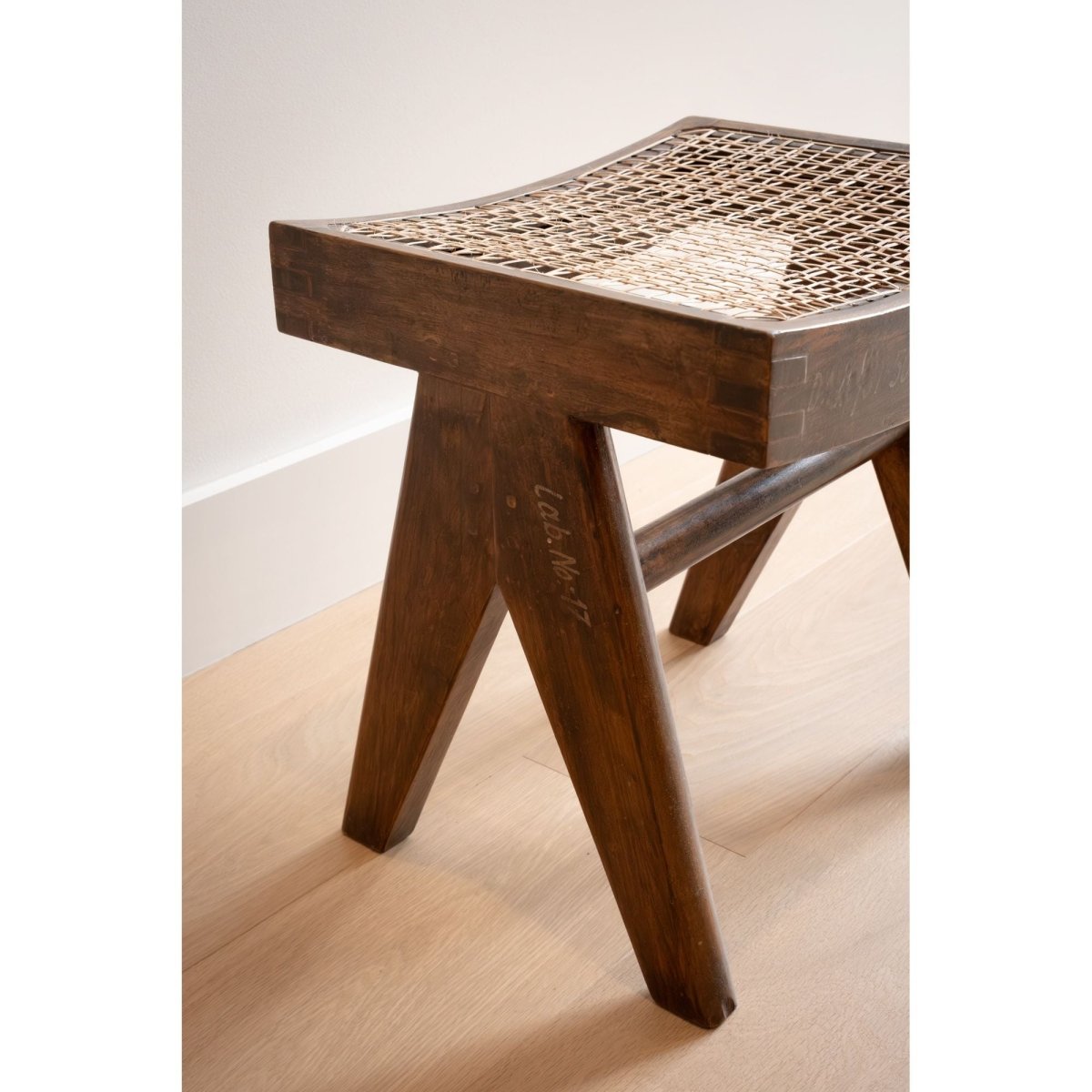 Original Pierre Jeanneret PJ-SI-34-A Stool with original stencilling. DAV College, India, Chandigarh, c1960s. Solid teak. This stool has been professionally restored with new cane and light finish. Original condition still visible on the inside.