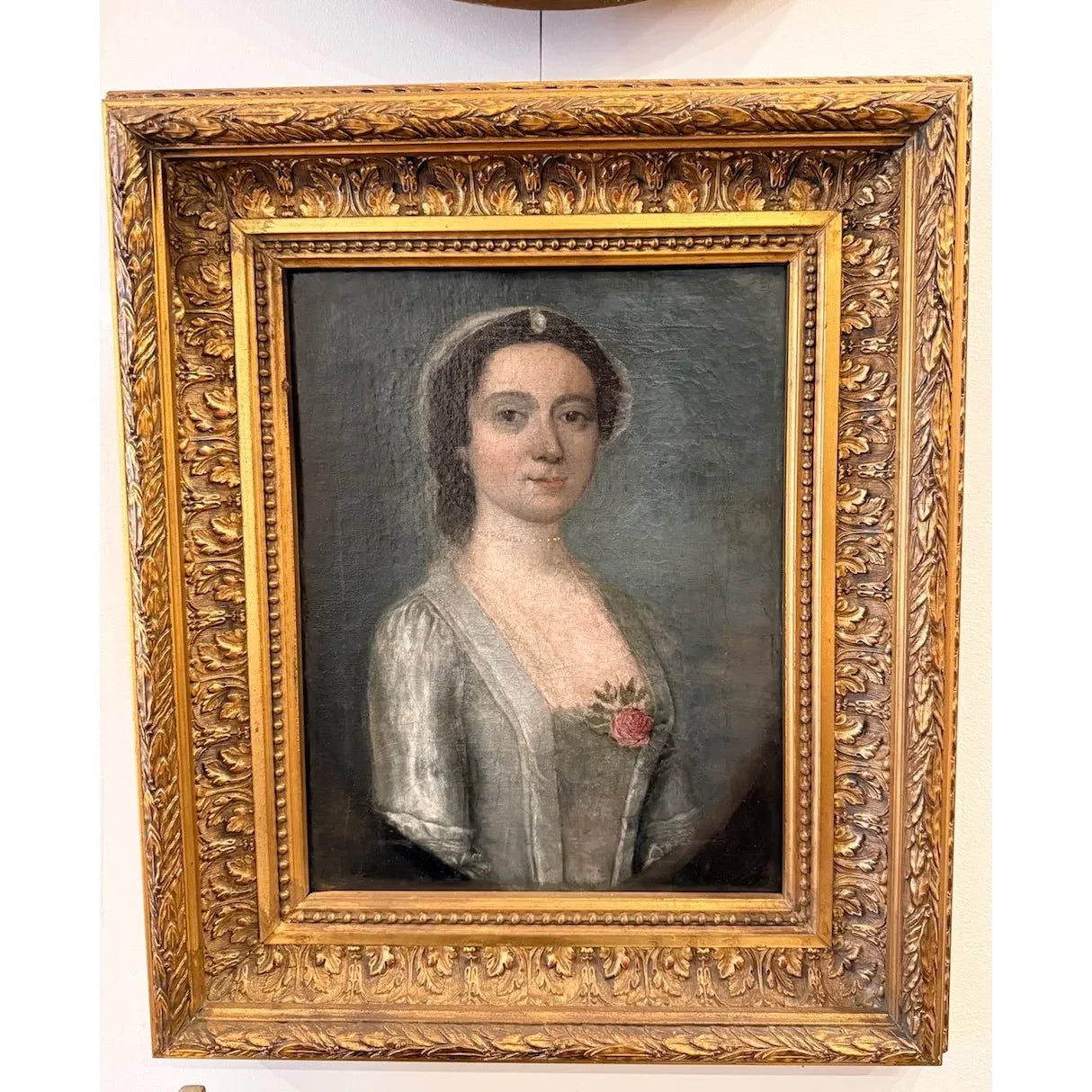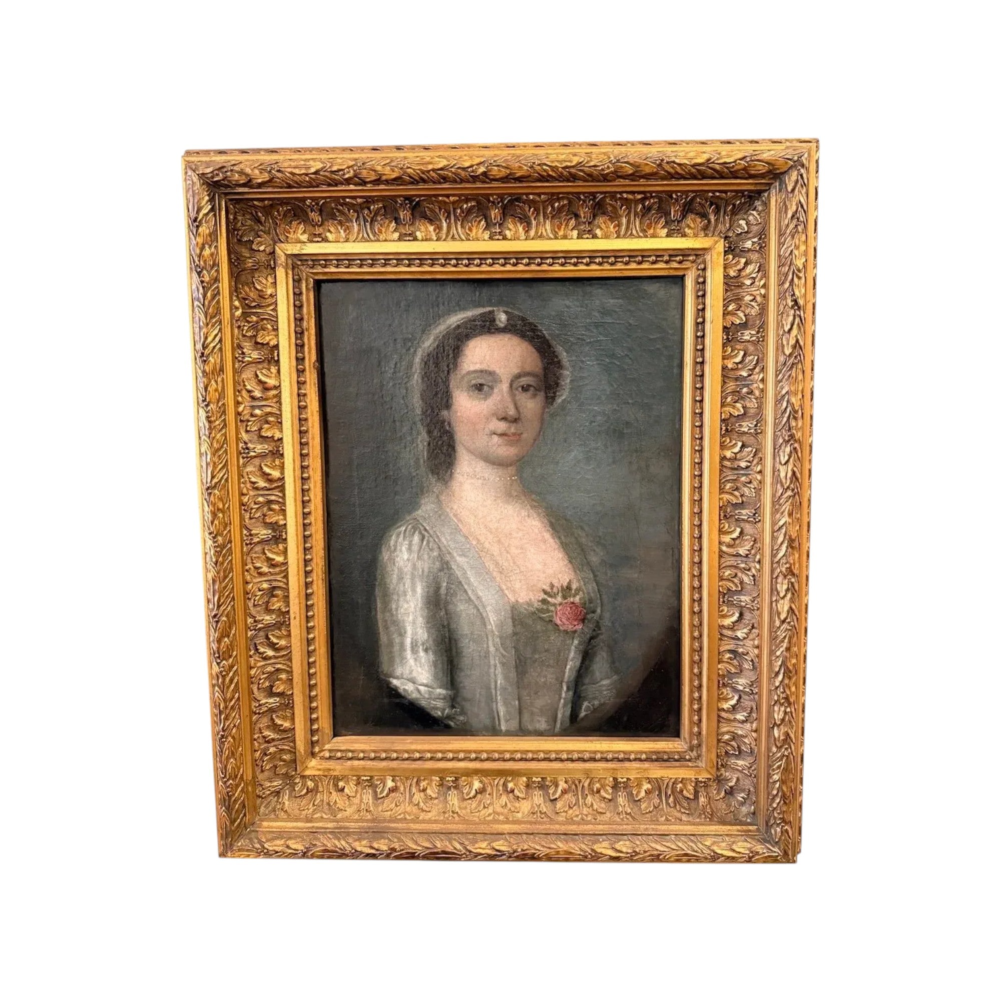 18thc Portrait of a young woman with a rose. Oil on canvas in giltwood frame. size 49cm h x 51cm w