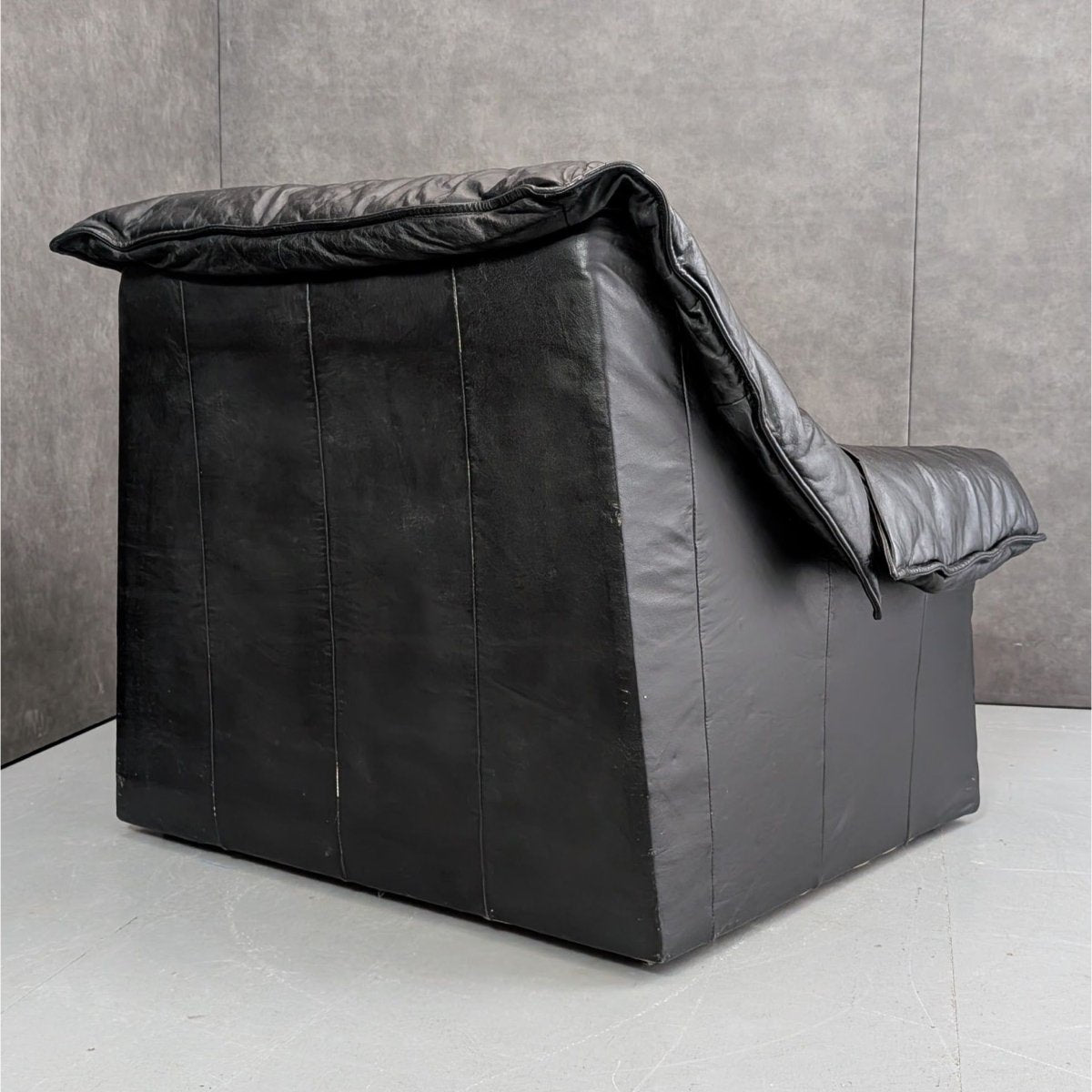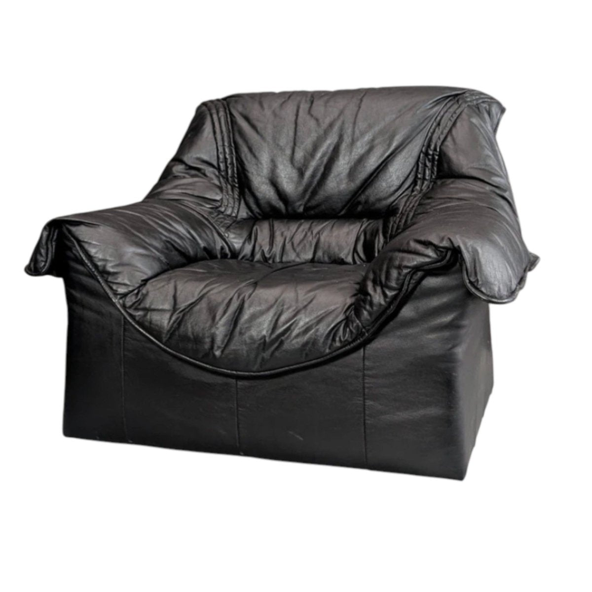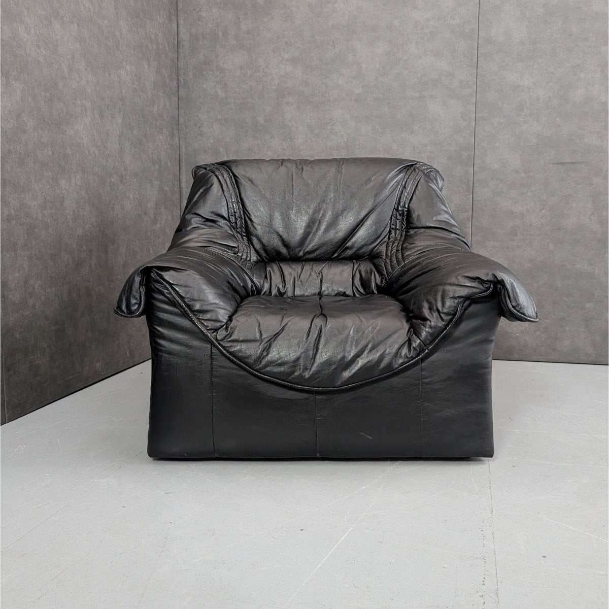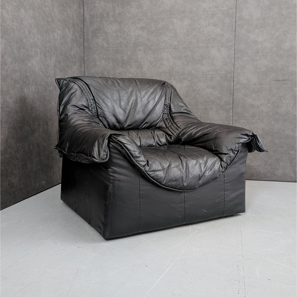 Produced during the 1980s shift toward softer postmodern domestic seating, this leather armchair reflects the era’s move away from rigid modernist geometry toward comfort driven volume and relaxed structure. The deep seat, low profile and overfilled cushions create a slouched envelope form typical of late Italian lounge design, where upholstery becomes the defining architecture rather than the frame beneath. Gathered seam detailing and generous proportions emphasise informal living over display, aligning the piece with the relaxed luxury interiors emerging across Europe at the time. It sits with weight and ease, designed for long use rather than visual restraint.