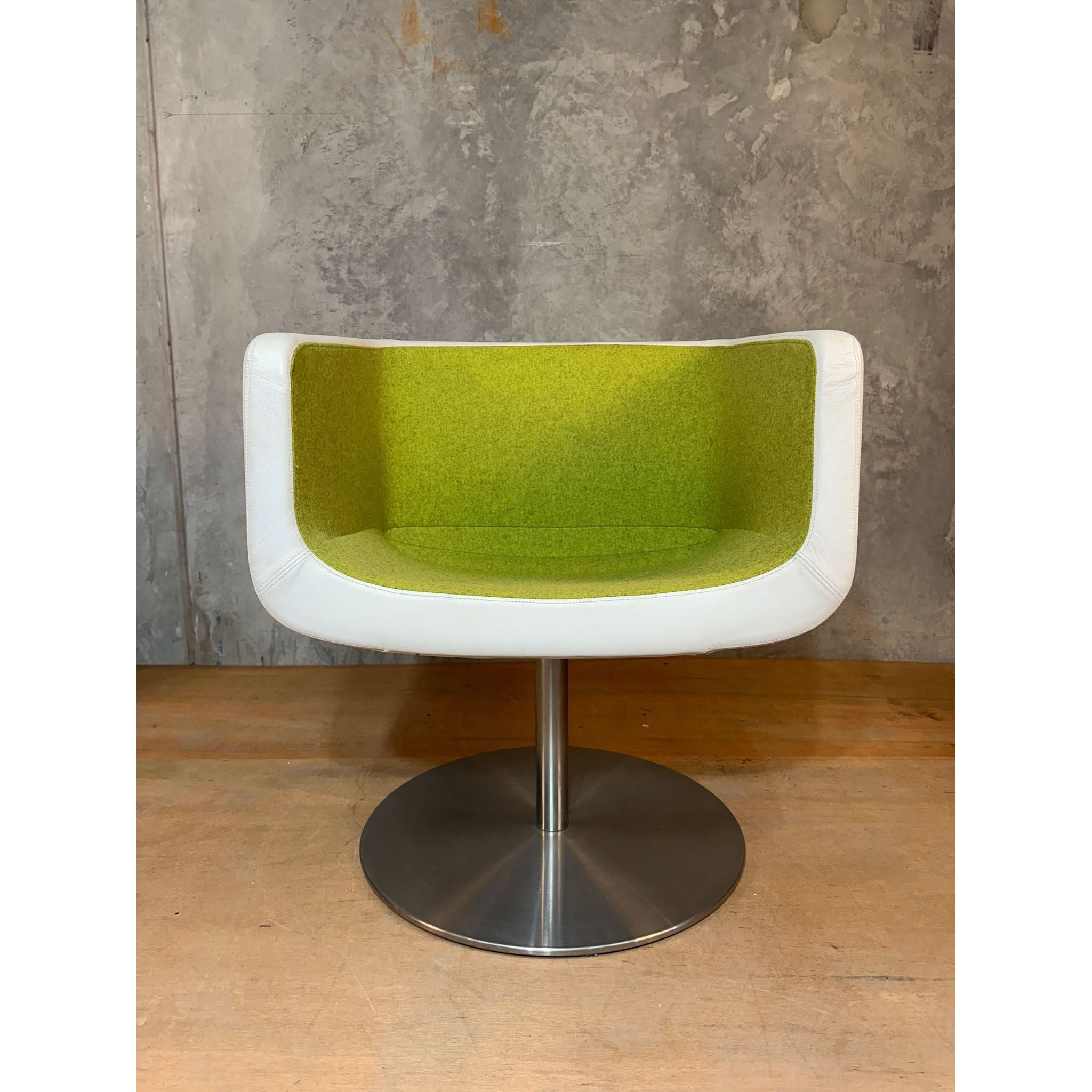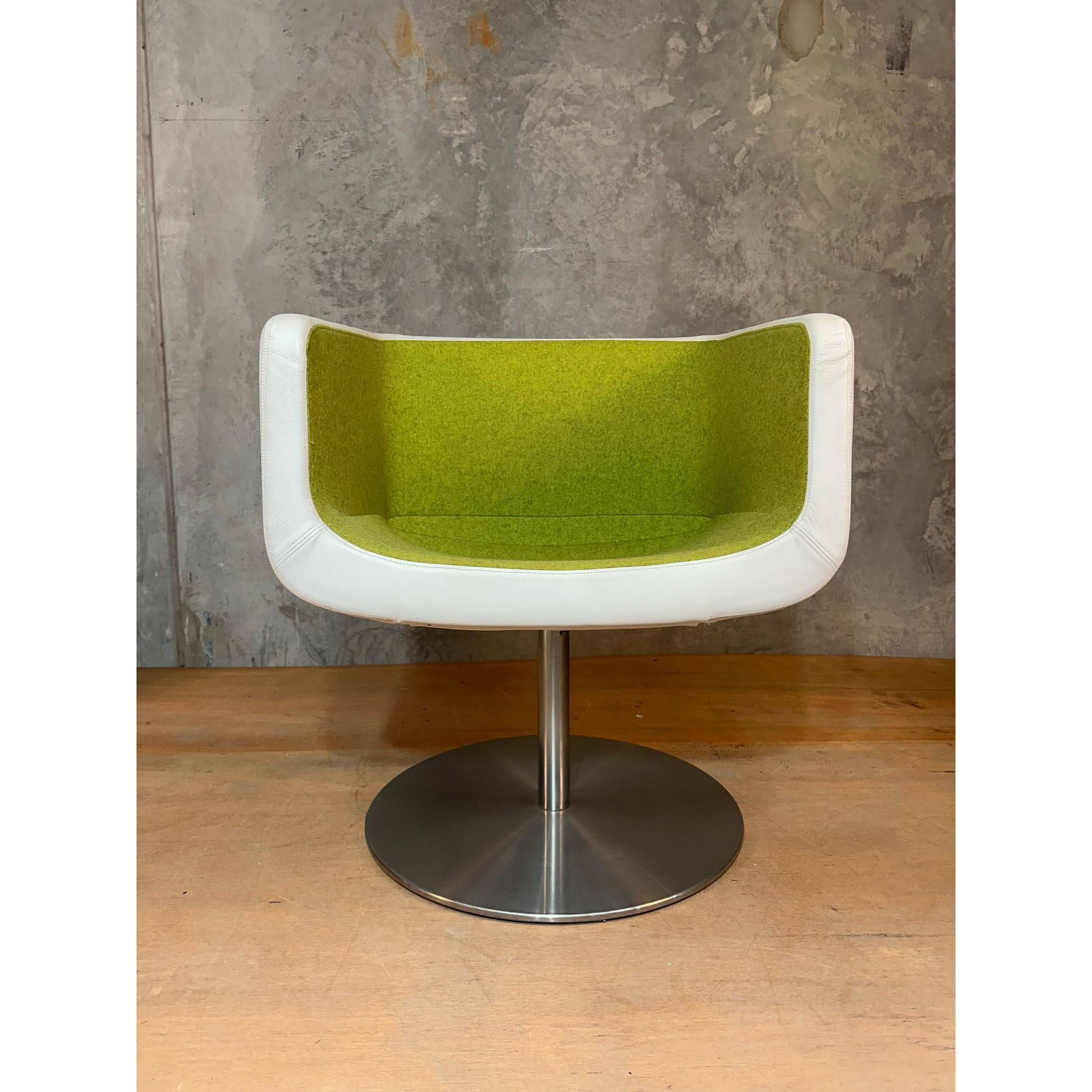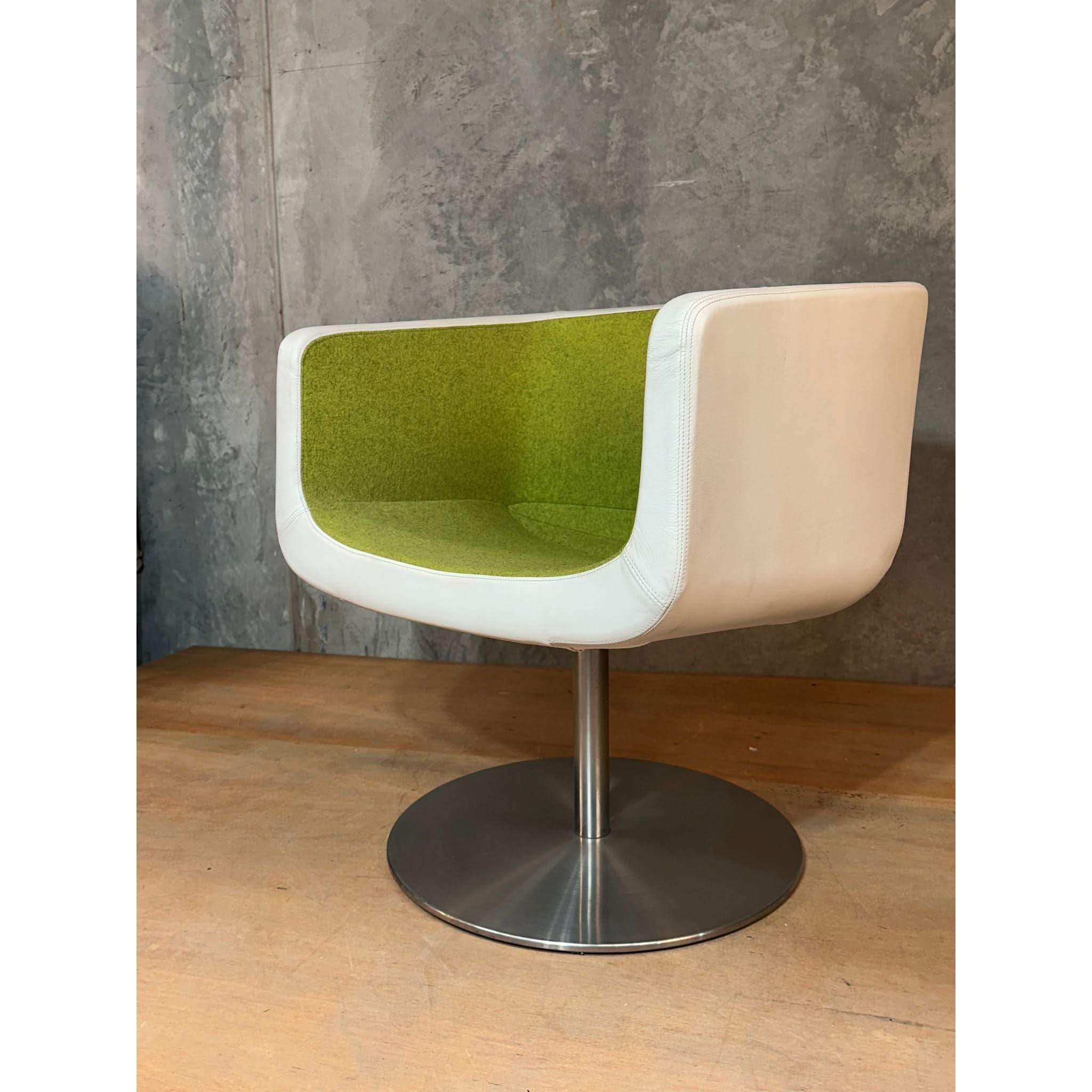 Bring designer impact and sustainable style to your space with this striking pair of retro Schamburg + Alvisse tub chairs. Upholstered in vibrant lime green fabric and grounded by sleek stainless steel swivel bases, these contemporary pieces blend comfort, function and refined aesthetics.