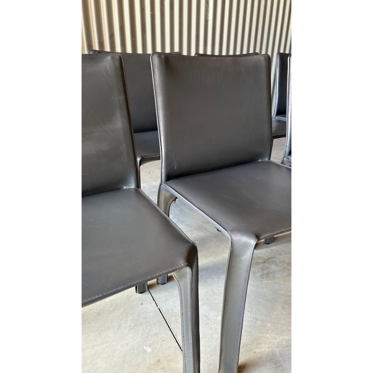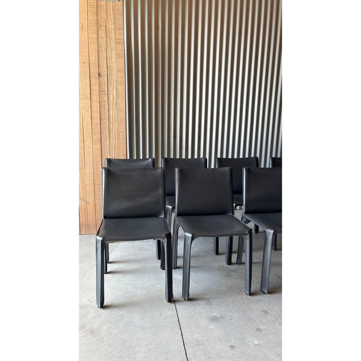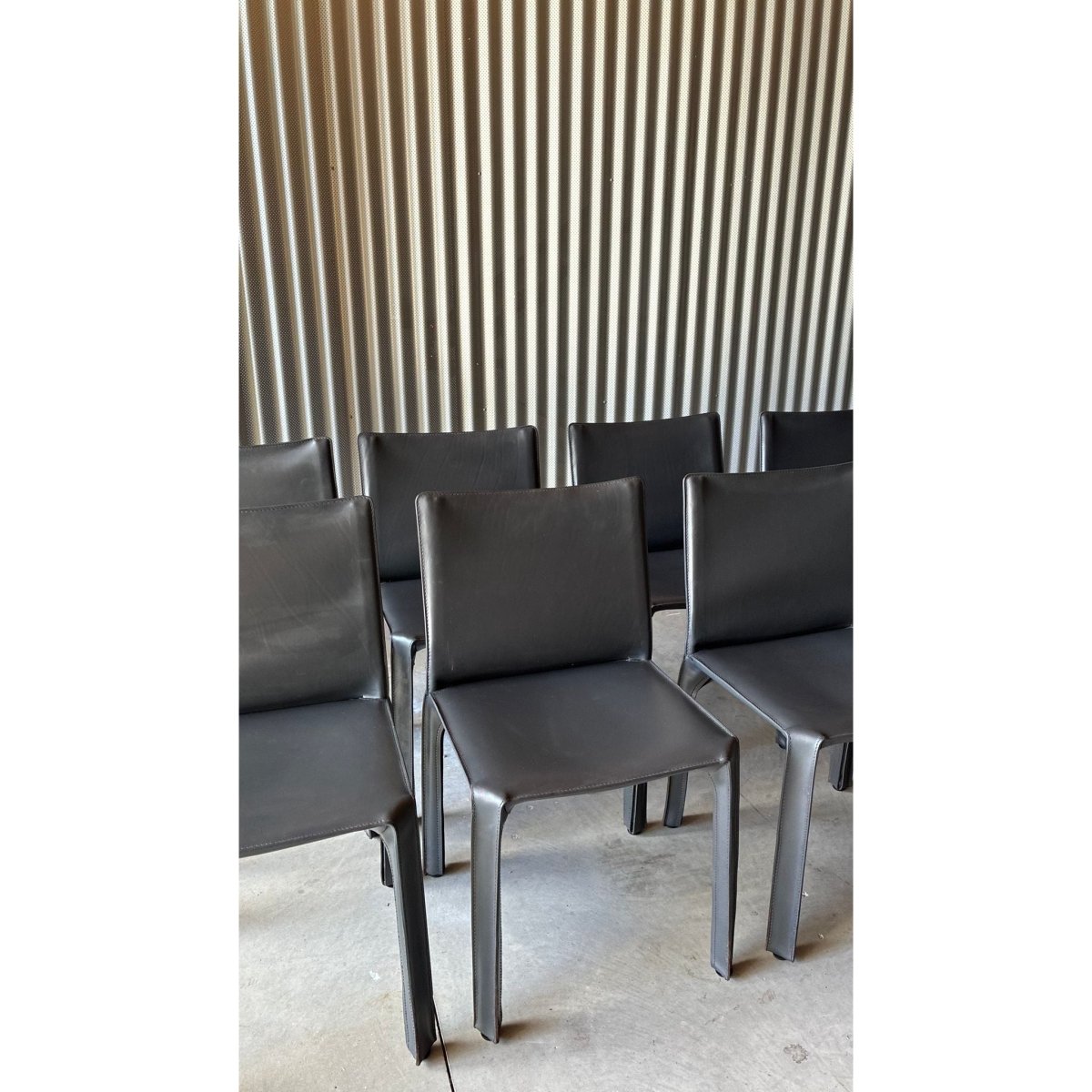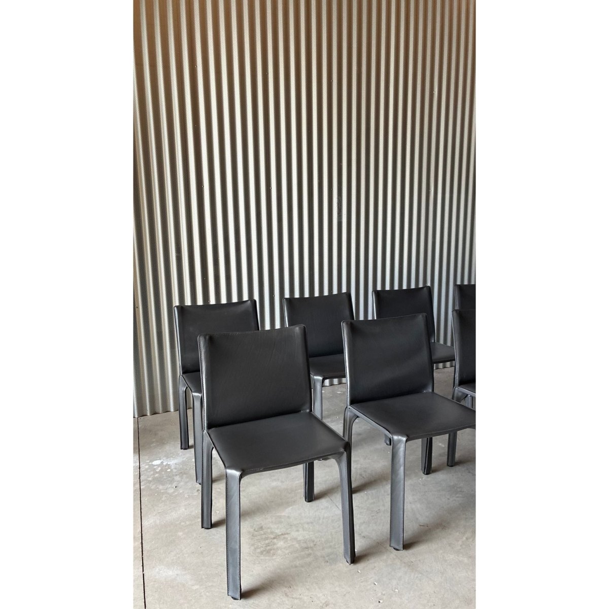 A set of eight dining chairs attributed to the influential CAB 412 chair, designed byItalian architect Mario Bellini. Known for their innovative construction; a leather skin stretched over a steel skeleton - the CAB series has become a cornerstone of late-20th century Italian design.