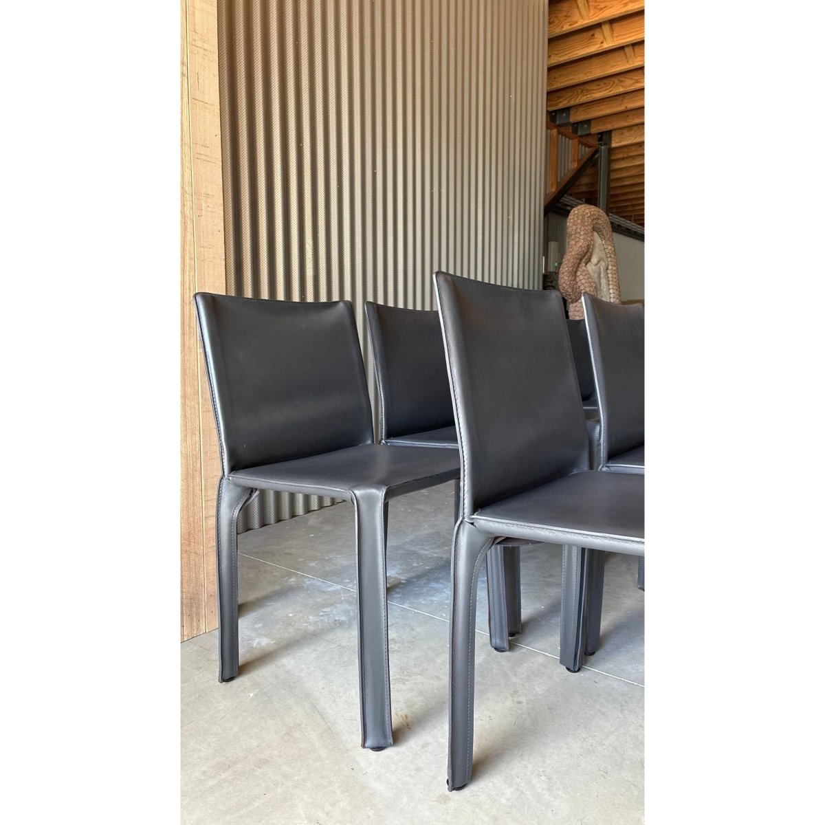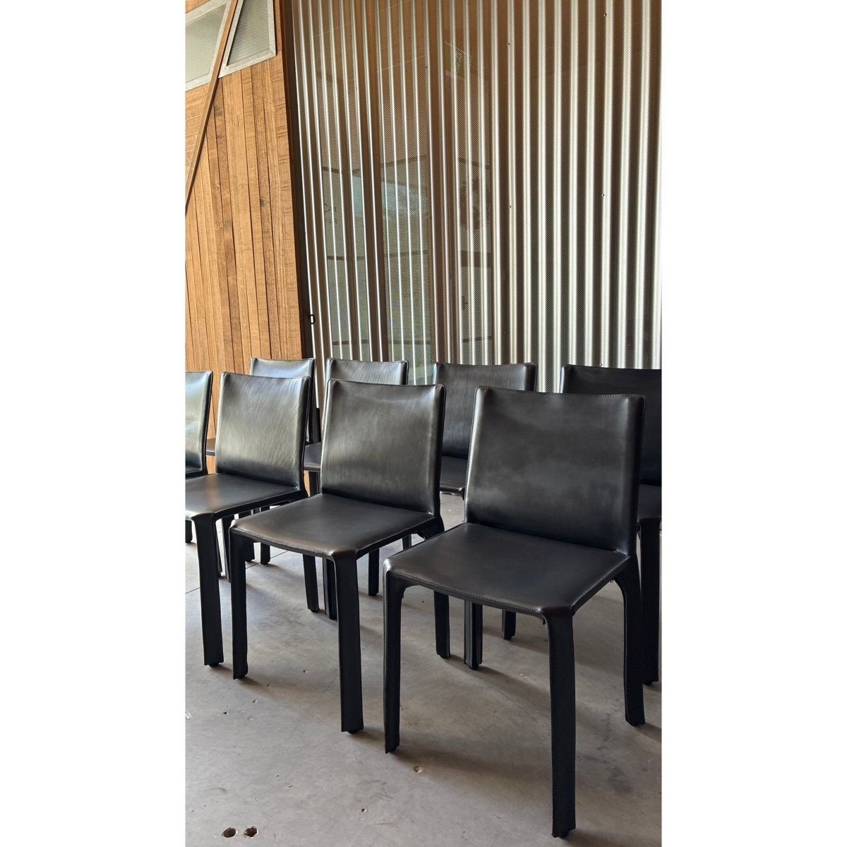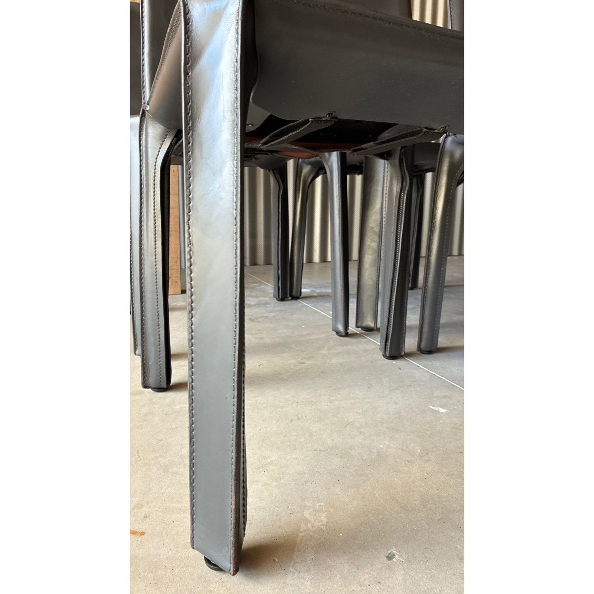 A set of eight dining chairs attributed to the influential CAB 412 chair, designed byItalian architect Mario Bellini. Known for their innovative construction; a leather skin stretched over a steel skeleton - the CAB series has become a cornerstone of late-20th century Italian design.