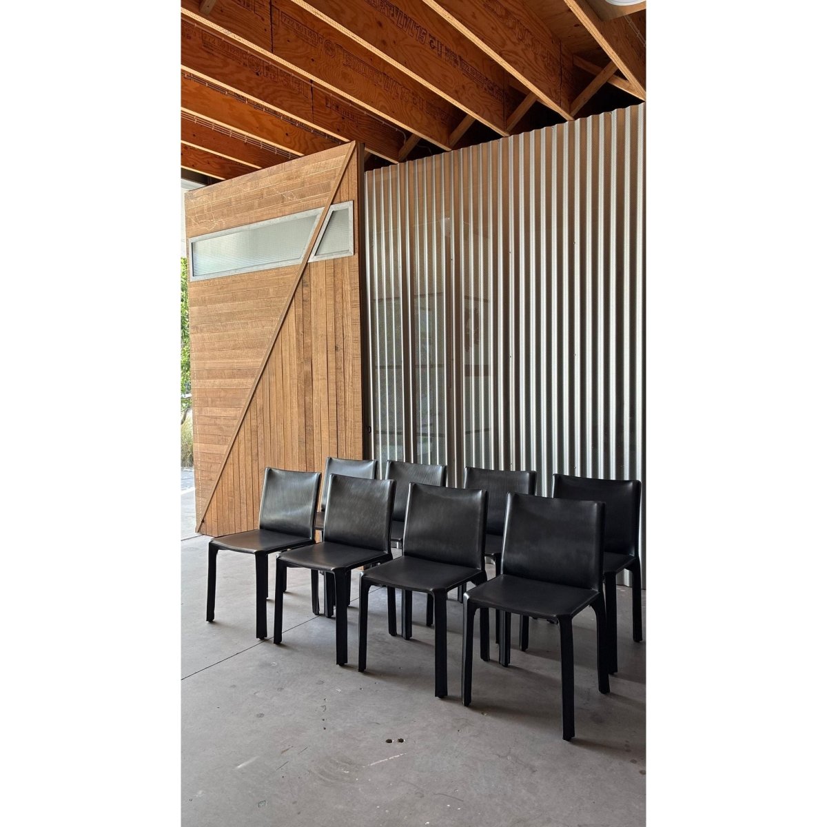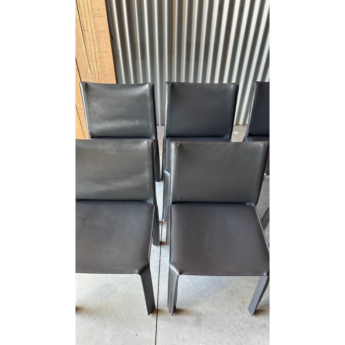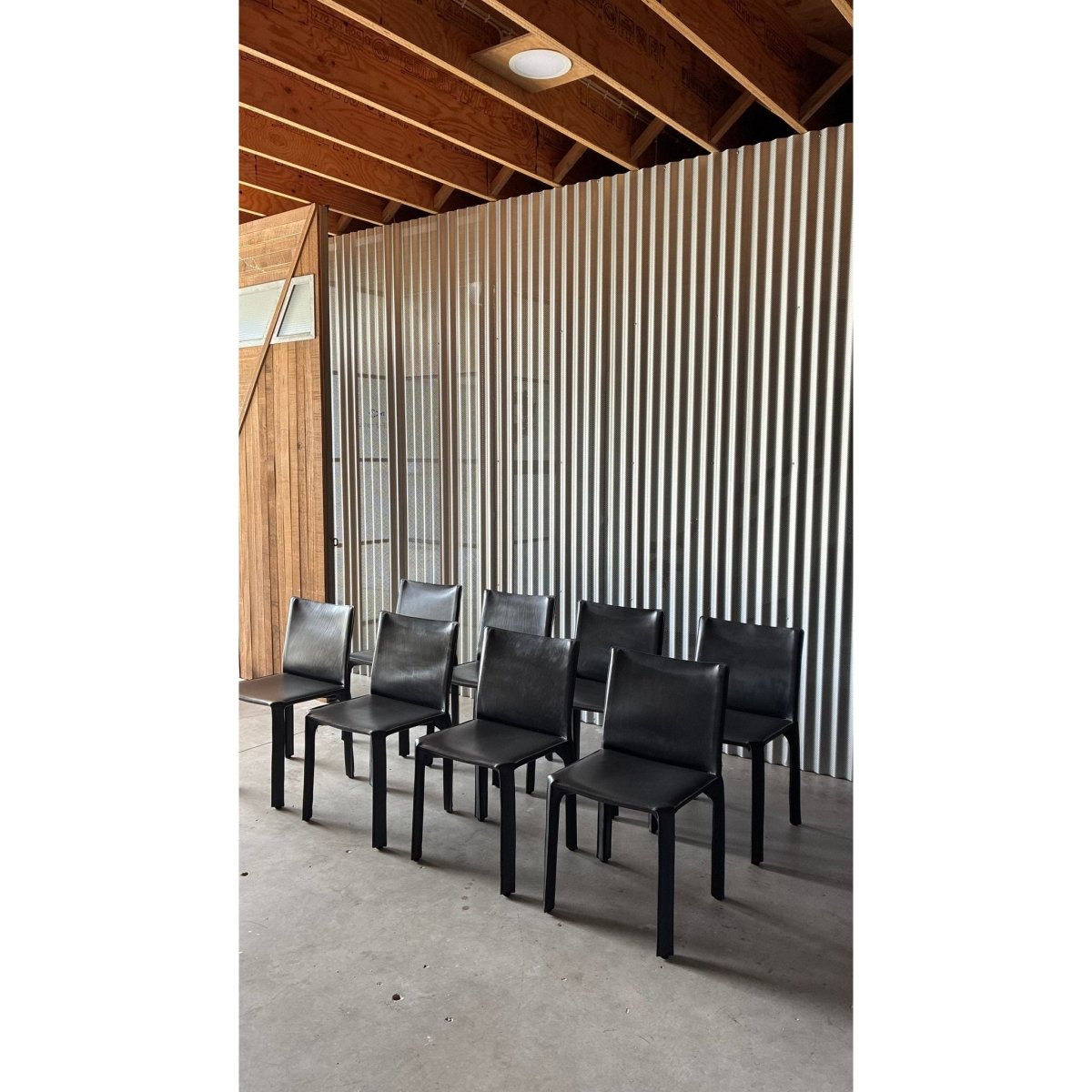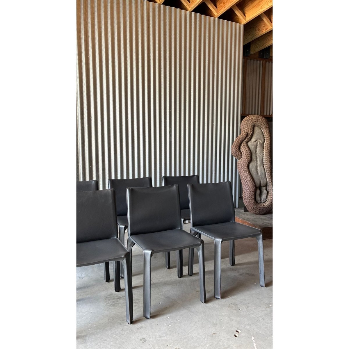 A set of eight dining chairs attributed to the influential CAB 412 chair, designed byItalian architect Mario Bellini. Known for their innovative construction; a leather skin stretched over a steel skeleton - the CAB series has become a cornerstone of late-20th century Italian design.