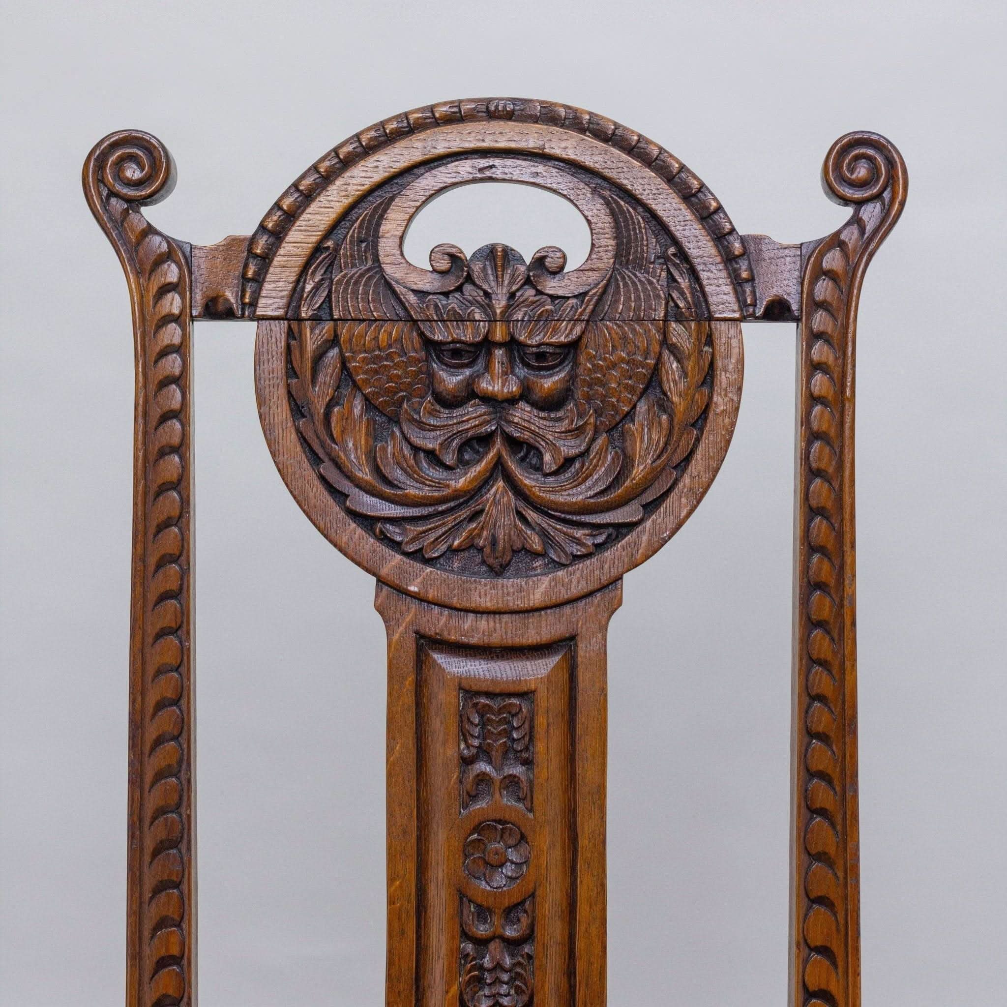 A set of four quality, hand-carved chestnut, 'Man of the Northwind' dining chairs, circa 1900. Two chairs have leather upholstered seats, and two are painted canvas.
