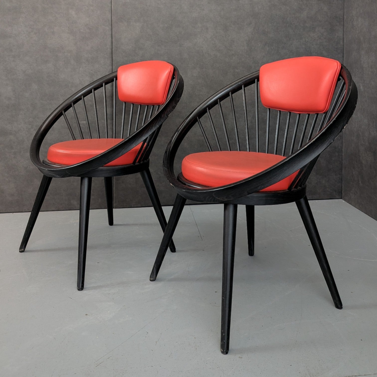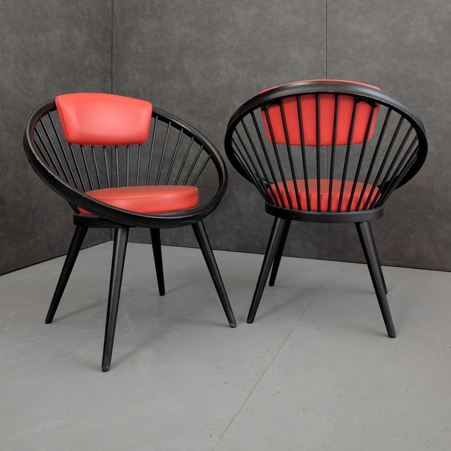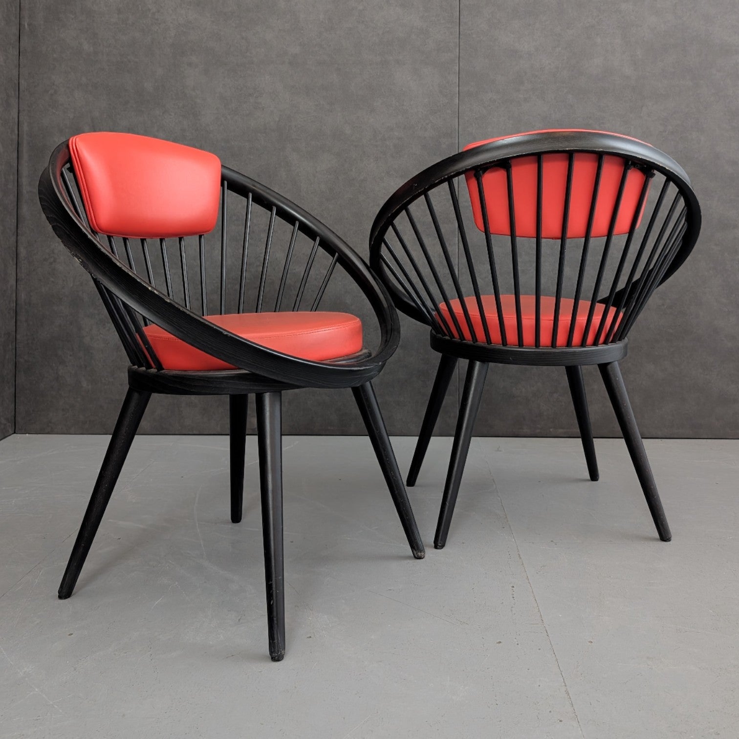 Designed by Yngve Ekström and produced by Swedese in Sweden during the 1970s, these armchairs reflect the designer’s mature modernist language, defined by clarity, proportion, and an intuitive understanding of how the body occupies space. Formed in black stained beech, the circular frame and radiating vertical spindles create a continuous structural loop, both enclosing and supporting the sitter. Upholstered seat and back cushions in red introduce warmth against the dark timber, reinforcing Ekström’s belief that comfort and visual discipline are not opposing ideas. Read together, the chairs carry a graphic presence, equally suited to considered residential interiors or design led commercial settings.