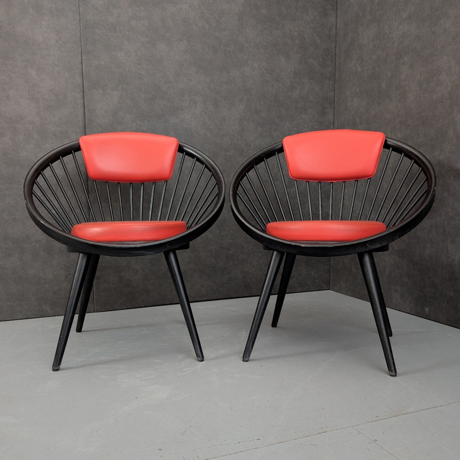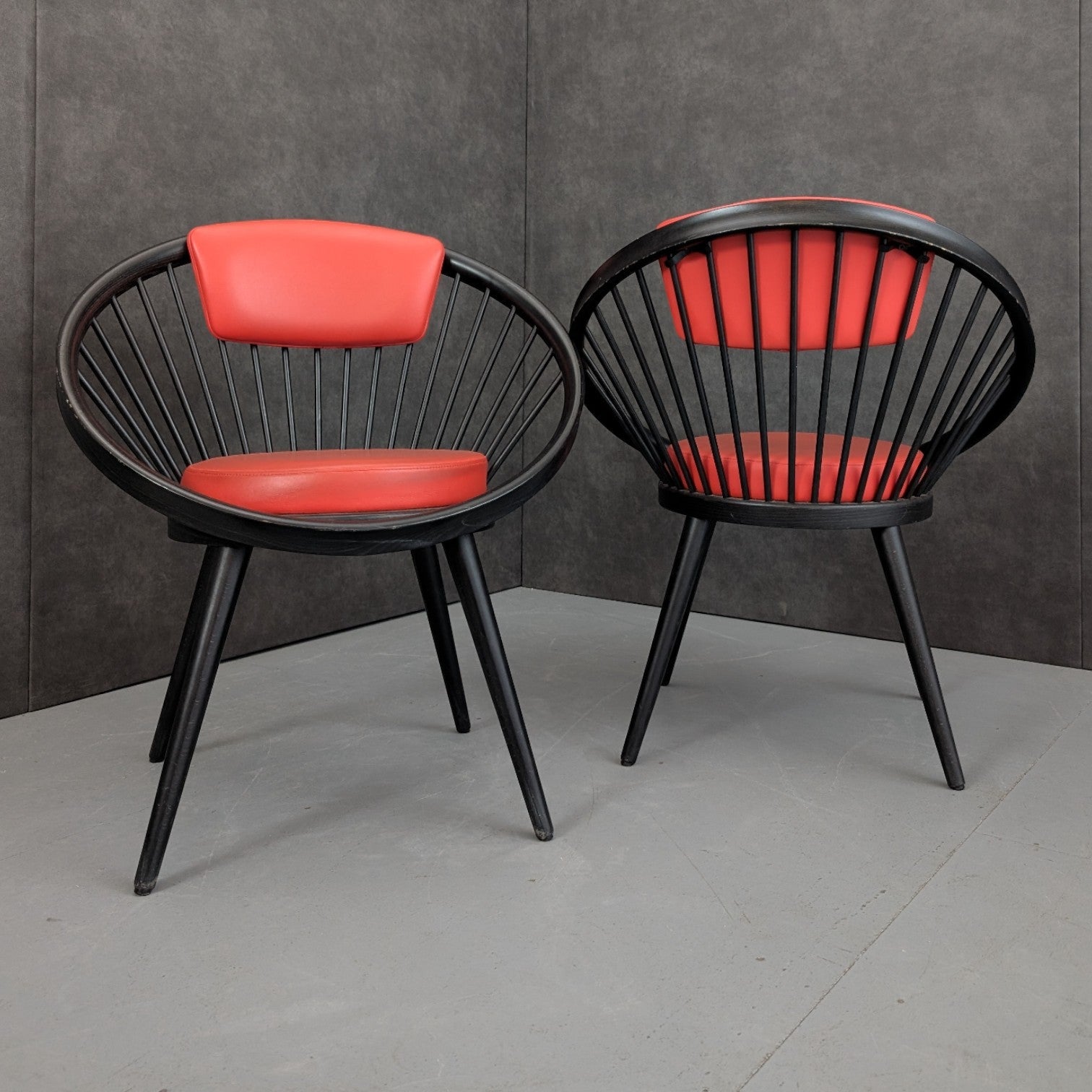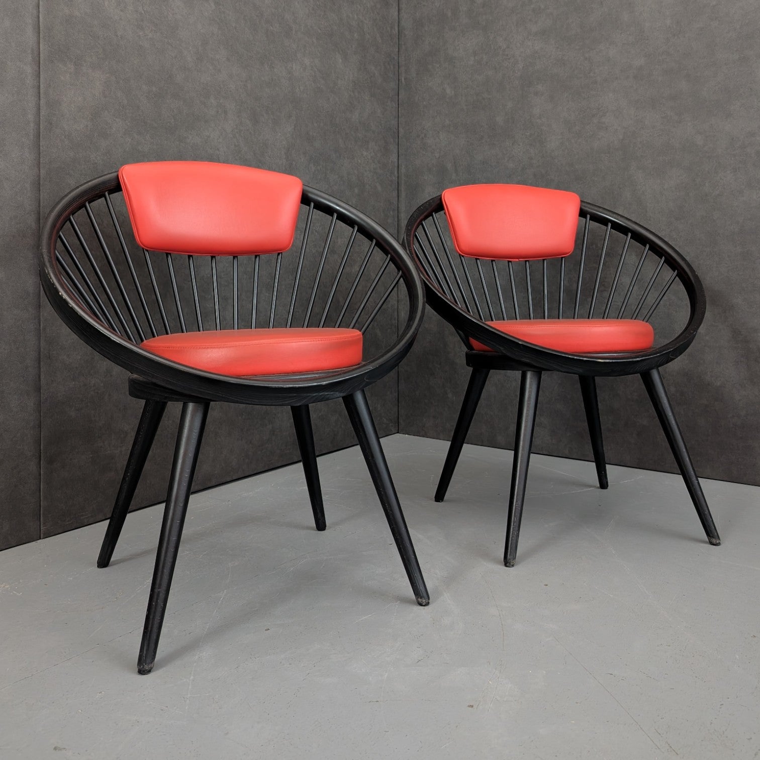 Designed by Yngve Ekström and produced by Swedese in Sweden during the 1970s, these armchairs reflect the designer’s mature modernist language, defined by clarity, proportion, and an intuitive understanding of how the body occupies space. Formed in black stained beech, the circular frame and radiating vertical spindles create a continuous structural loop, both enclosing and supporting the sitter. Upholstered seat and back cushions in red introduce warmth against the dark timber, reinforcing Ekström’s belief that comfort and visual discipline are not opposing ideas. Read together, the chairs carry a graphic presence, equally suited to considered residential interiors or design led commercial settings.