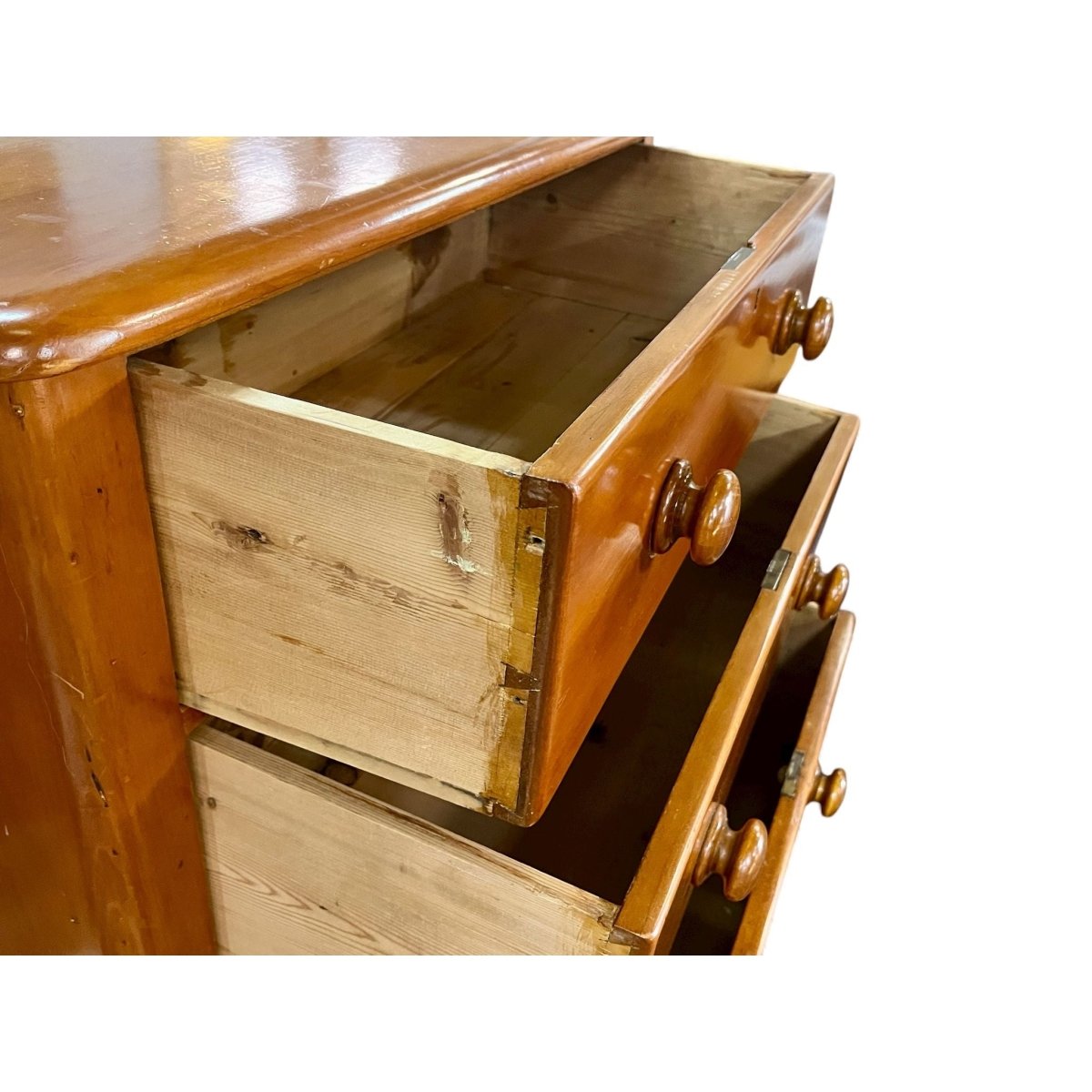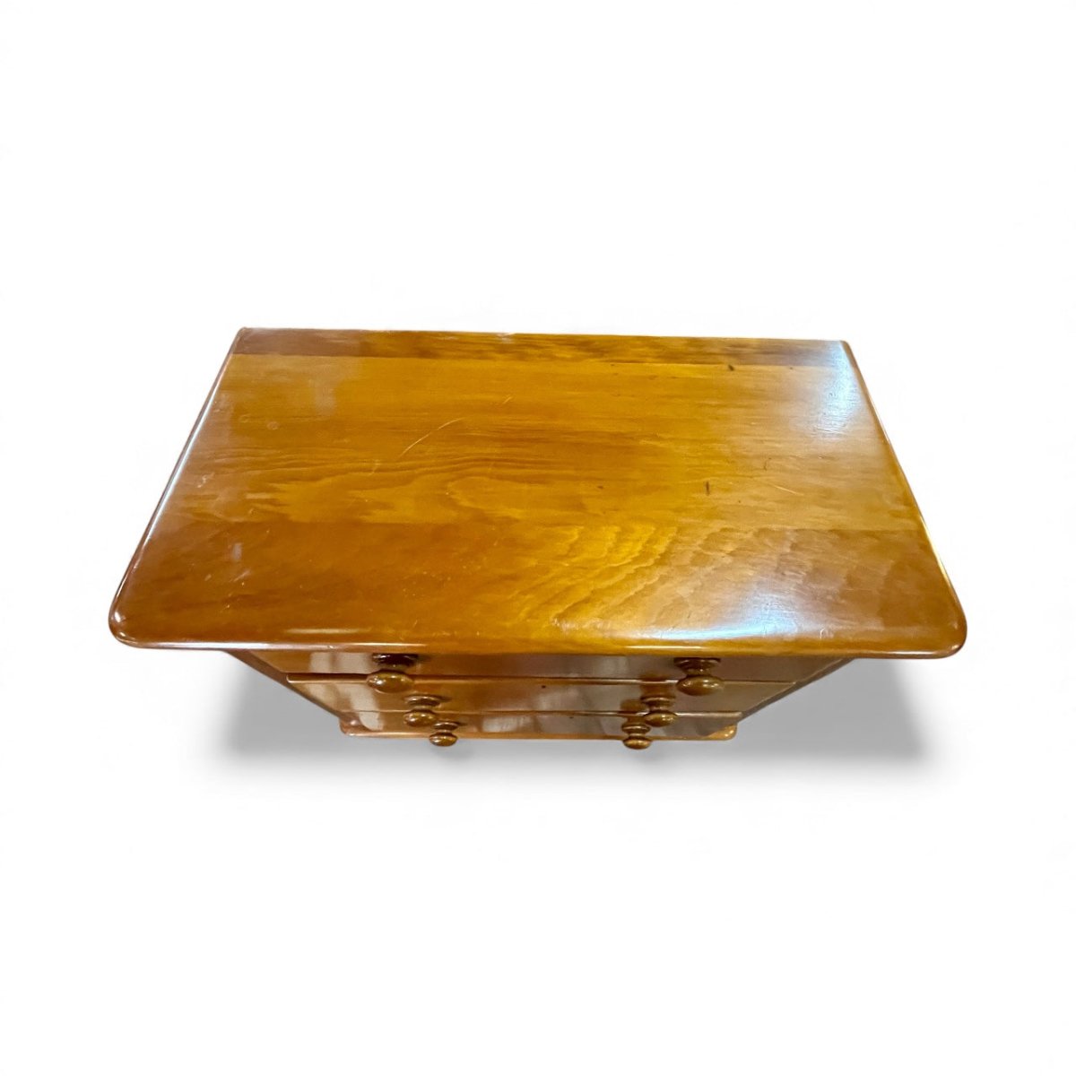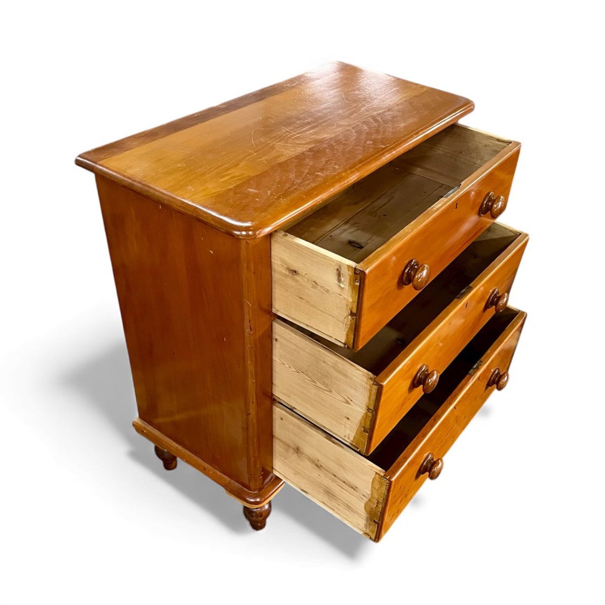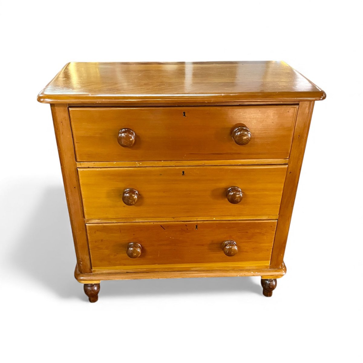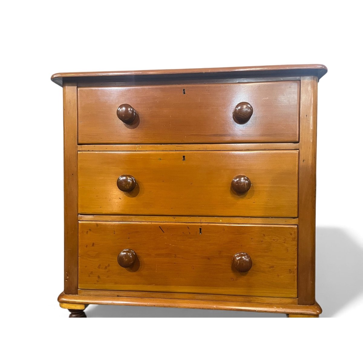 Antique chest of drawers 3 drawers, cedar, small Victorian 1900's AUSTRALIA. Solid Cedar. 3 three full drawers. Dovetail joinery. Wood turned knob handles. Rectangular with turned feet. Freestanding. Honey. Stained finish. Brass keyhole escutcheons, not centred on drawers. Lockable (does not come with key). Made in Australia in the 1900's. Sourced within the Mornington Peninsula.