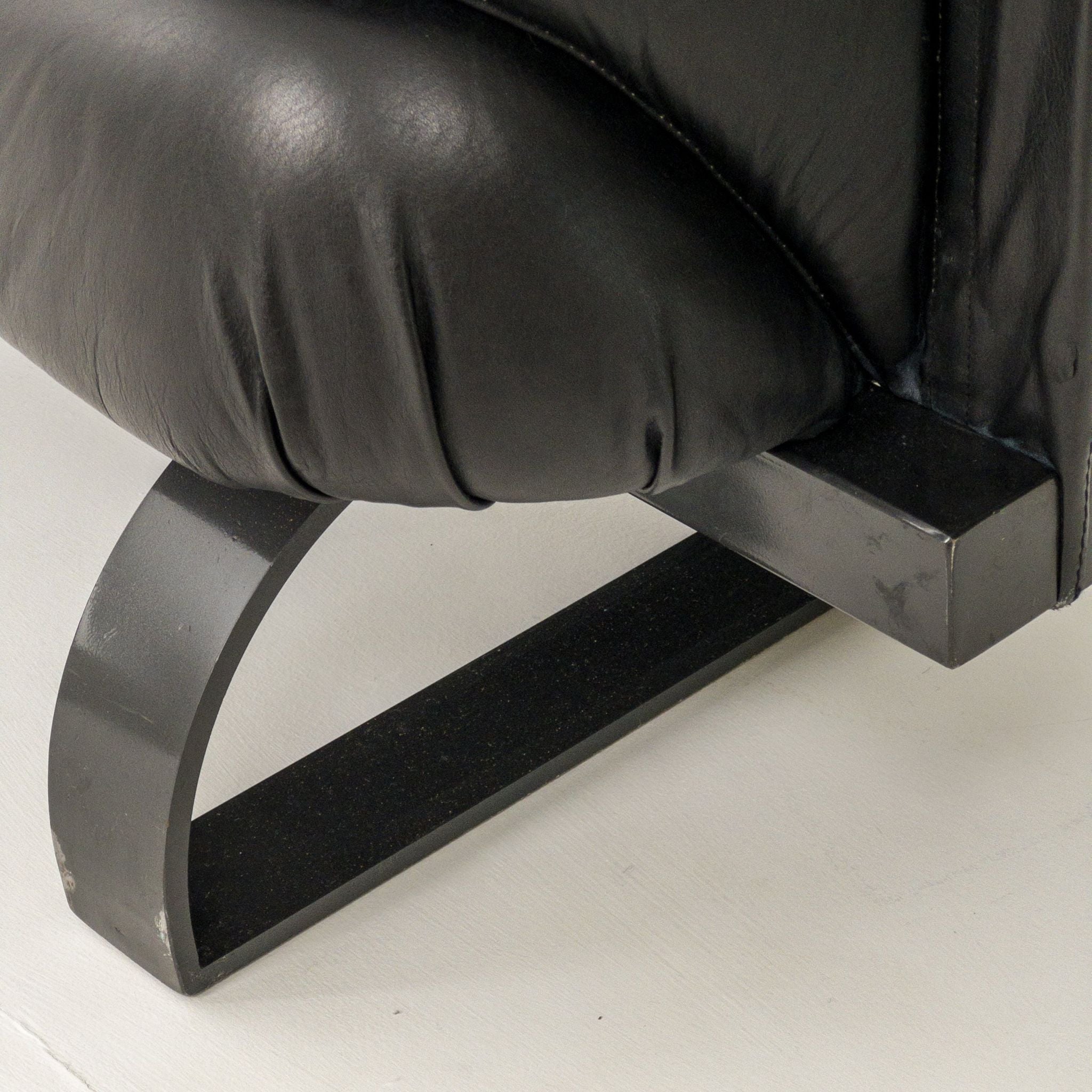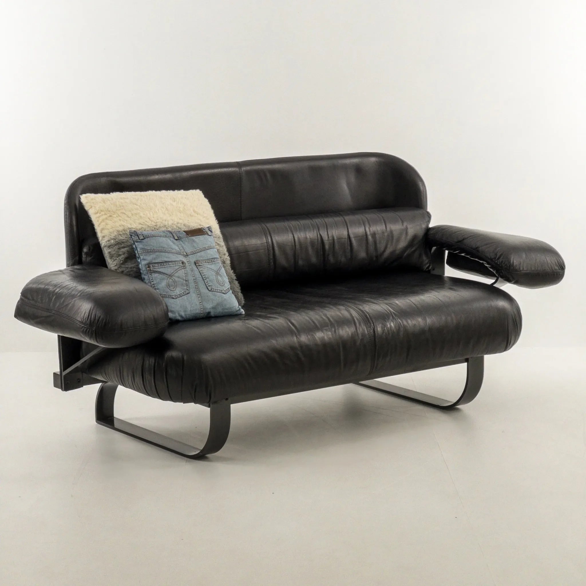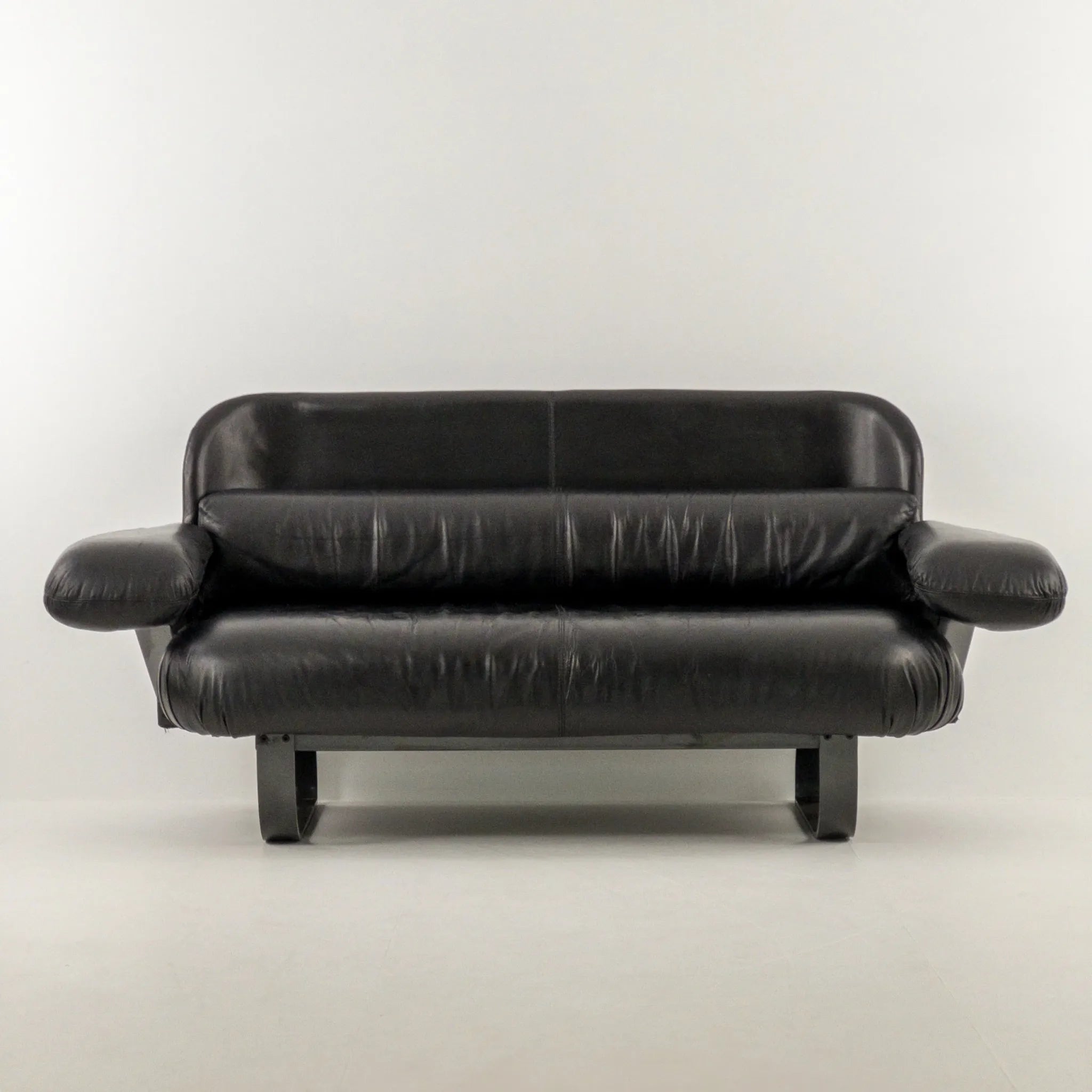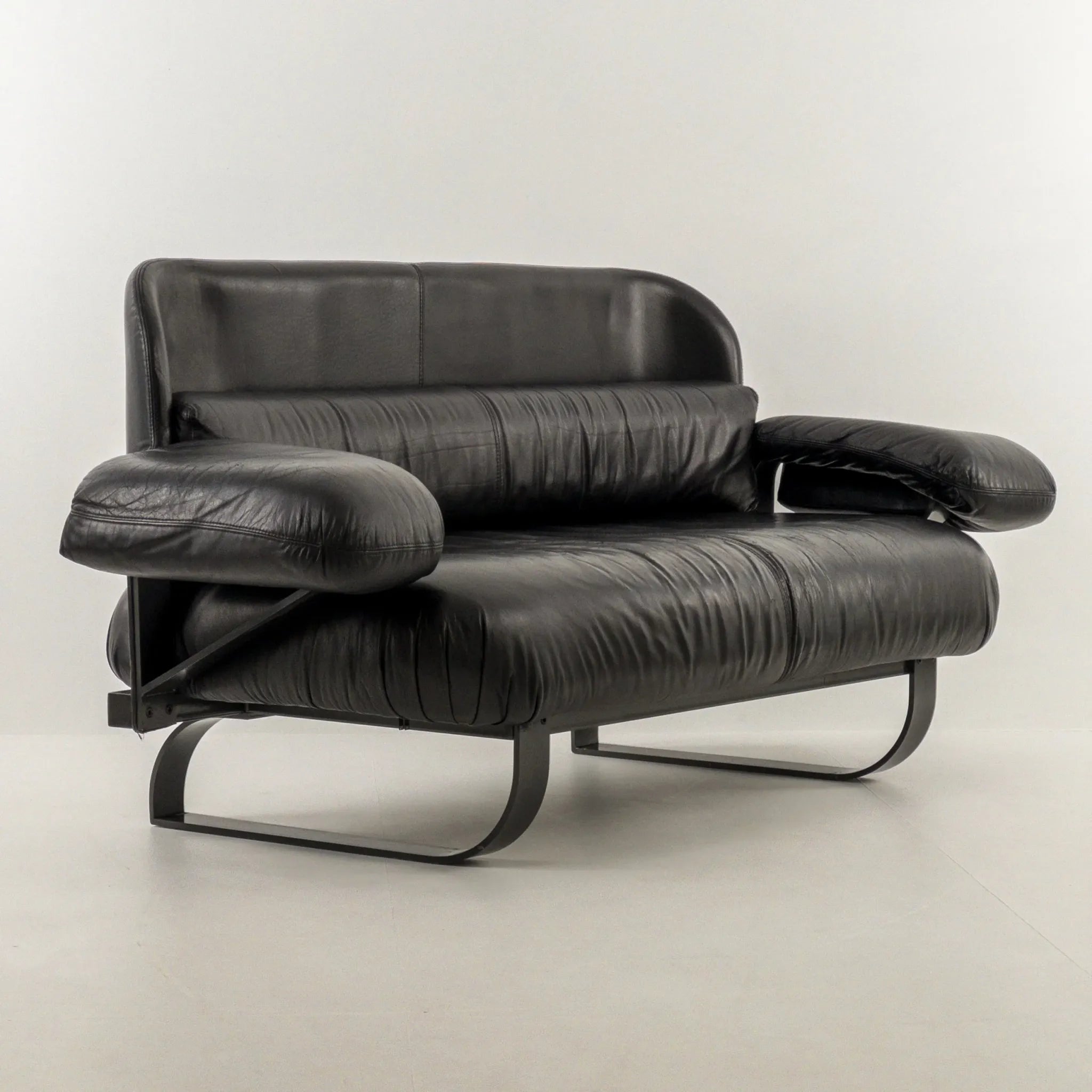 1980’s Mazzoli Witness Sofa by Michele De Lucci. Rare chance to own this hard to come by sofa. Post modern meets industrial meets Memphis vibes all rolled into one! Soft and supple leather with heavy duty steel framing. Cantilever style arms with exposed fixings reminiscent of a railway bridge with the sleigh style legs in matching profile flat bar steel. Plenty of vintage patina to the leather on the main contact surfaces but presents beautifully overall as evidenced by the photographs and is ready to be a well used feature in your desired space!