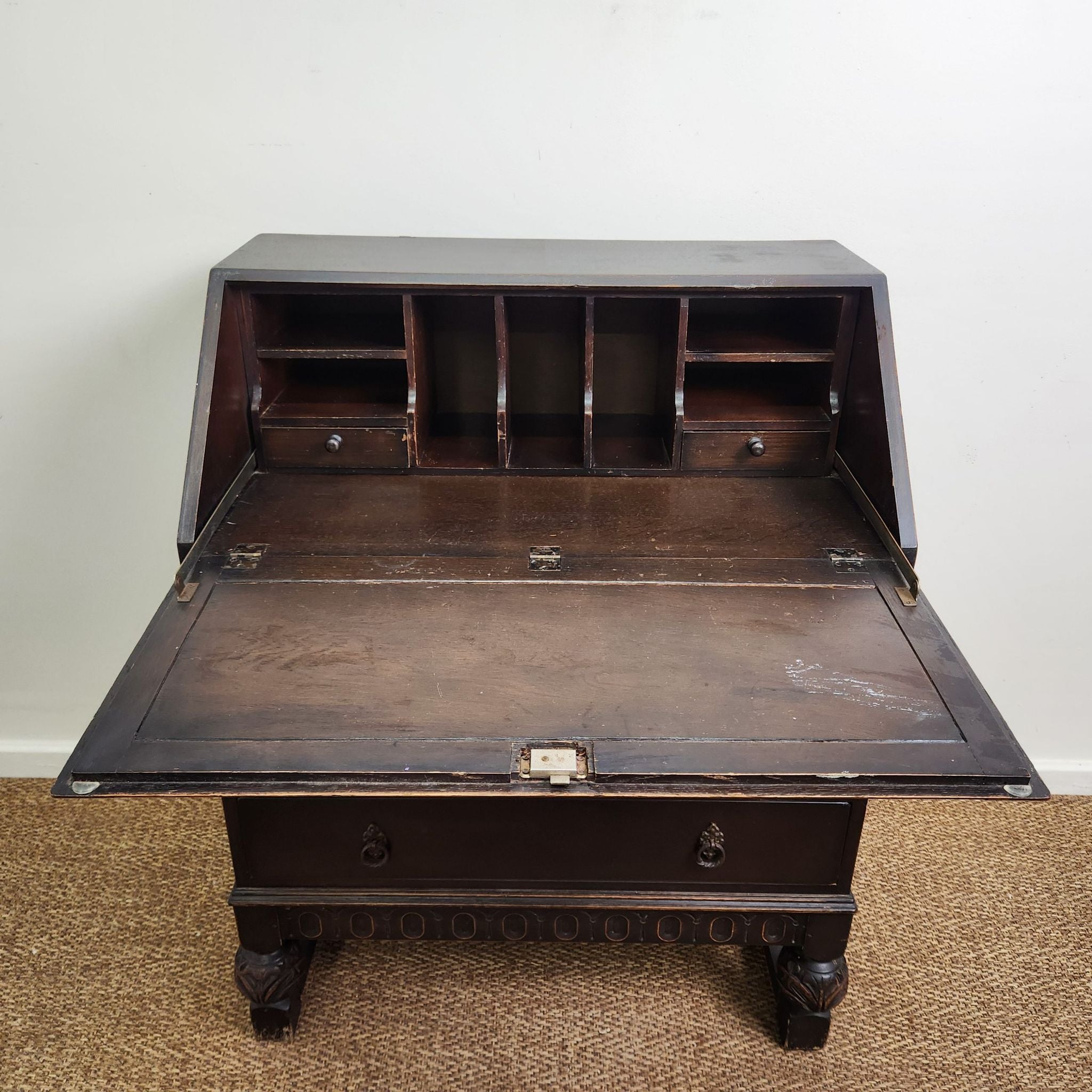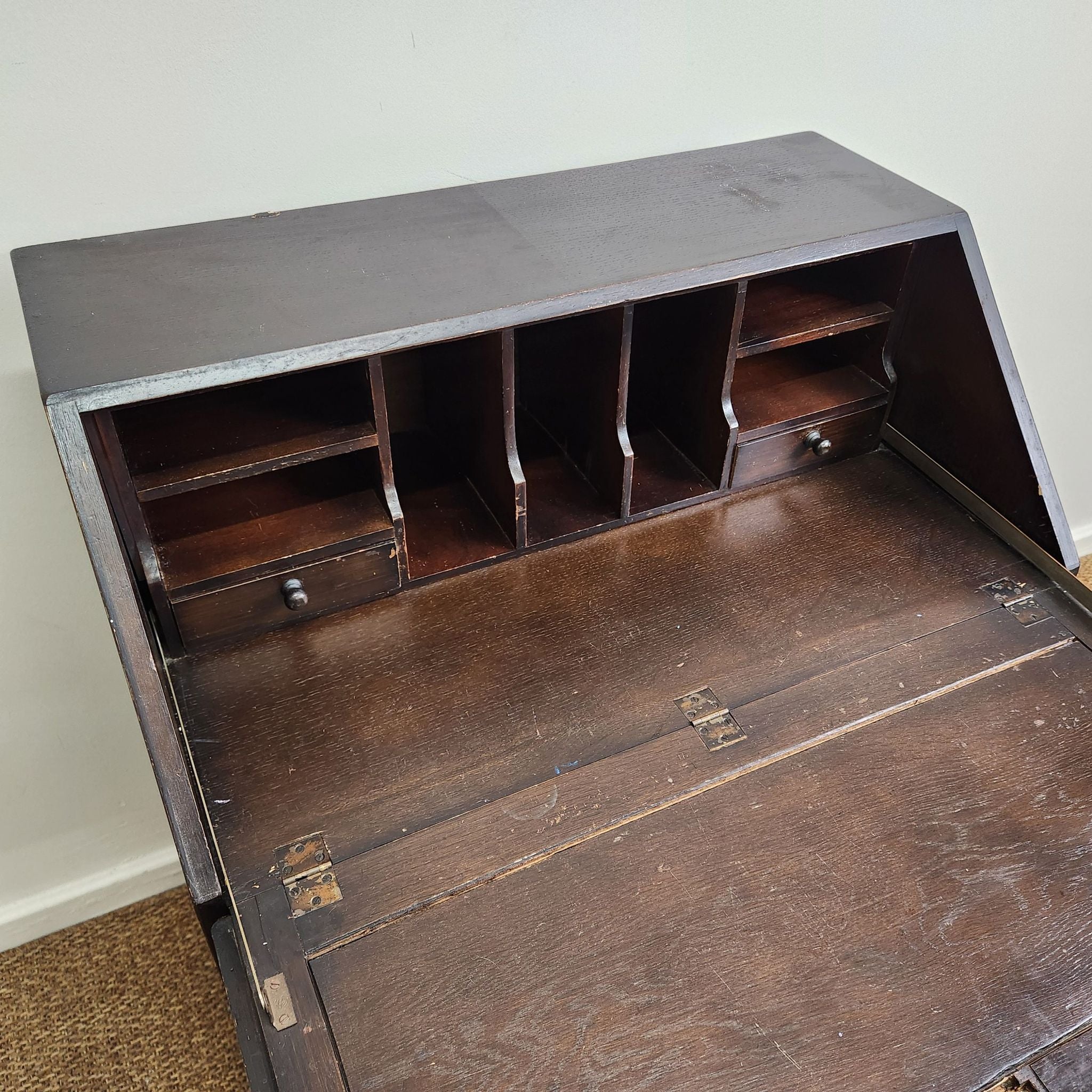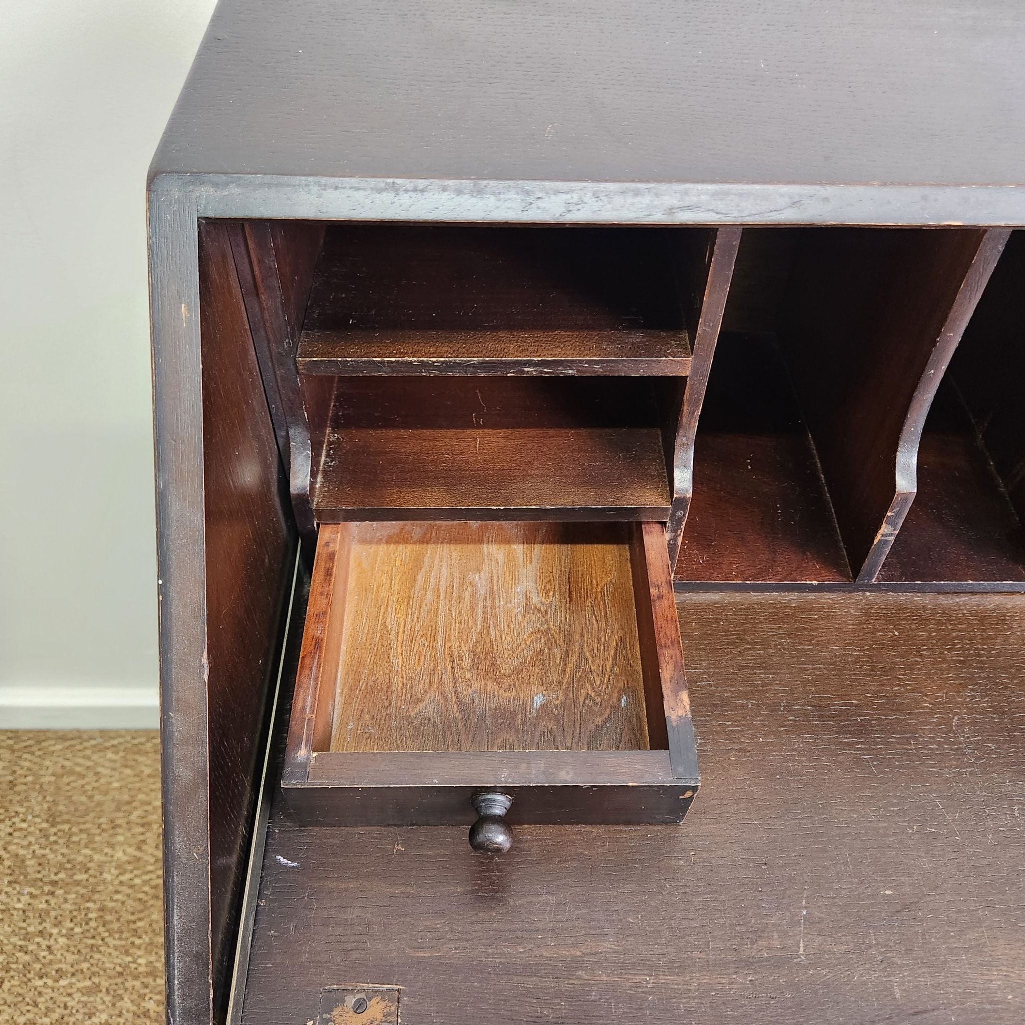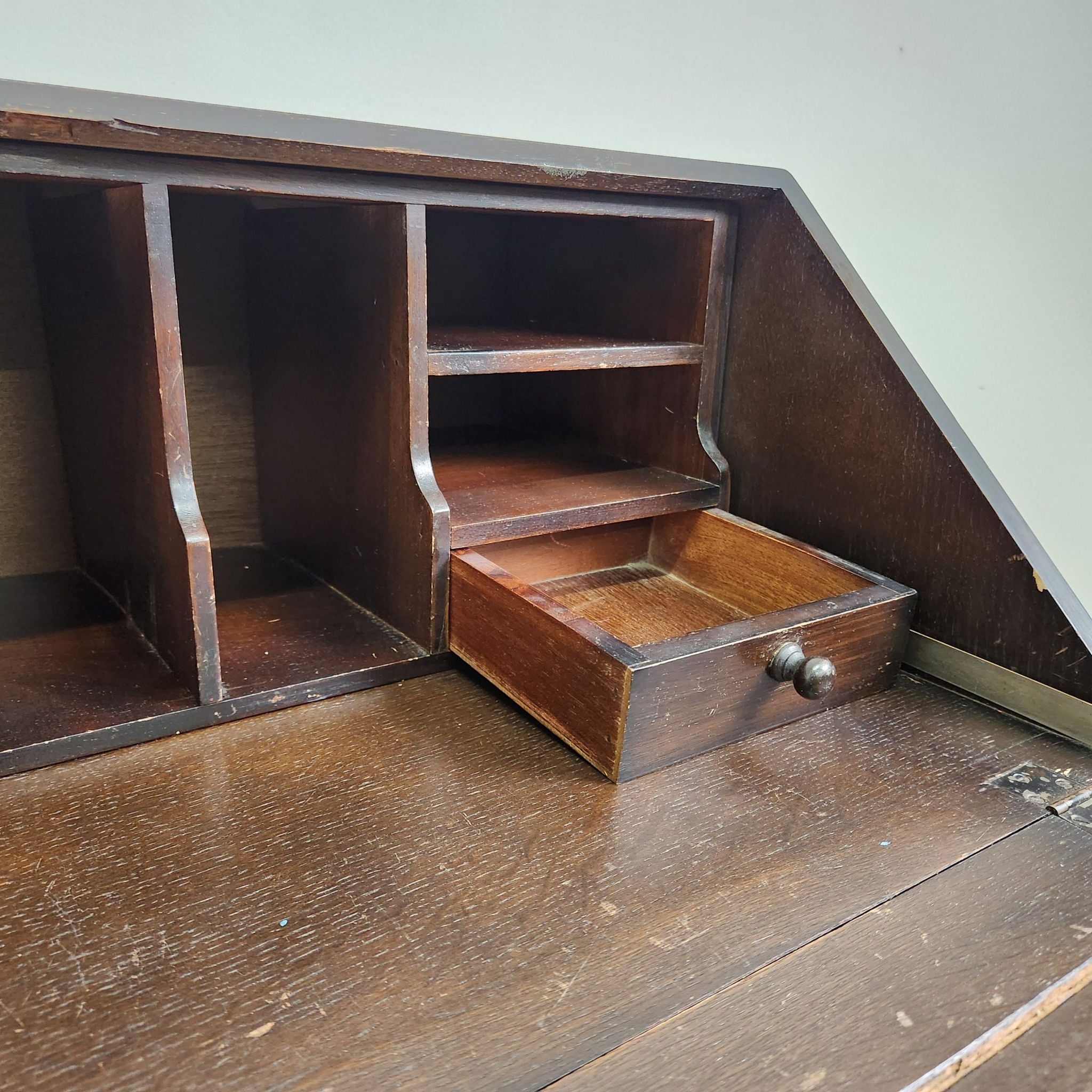 This vintage oak drop down bureau has a fold‑down writing surface above three drawers, combining workspace and storage in a single piece.
