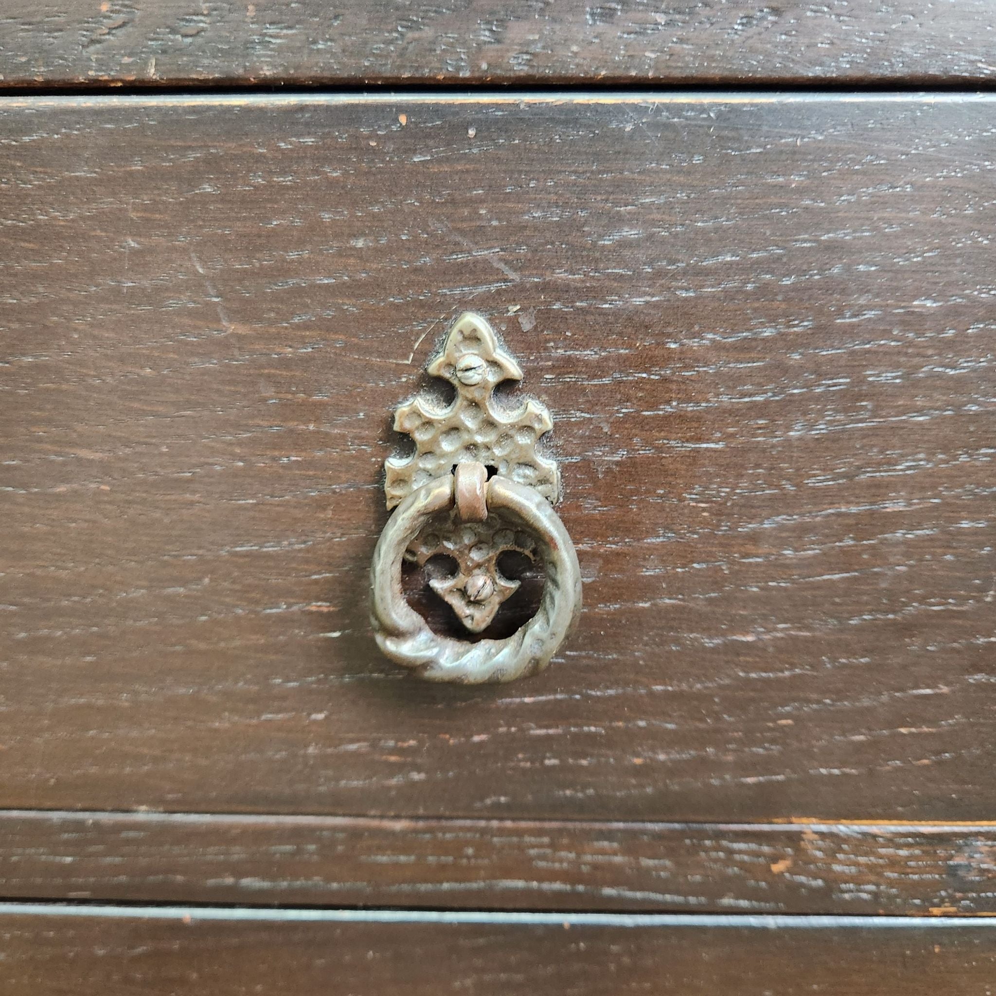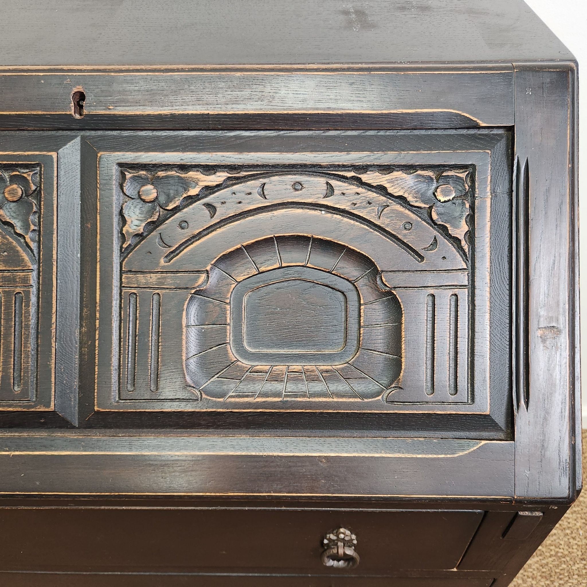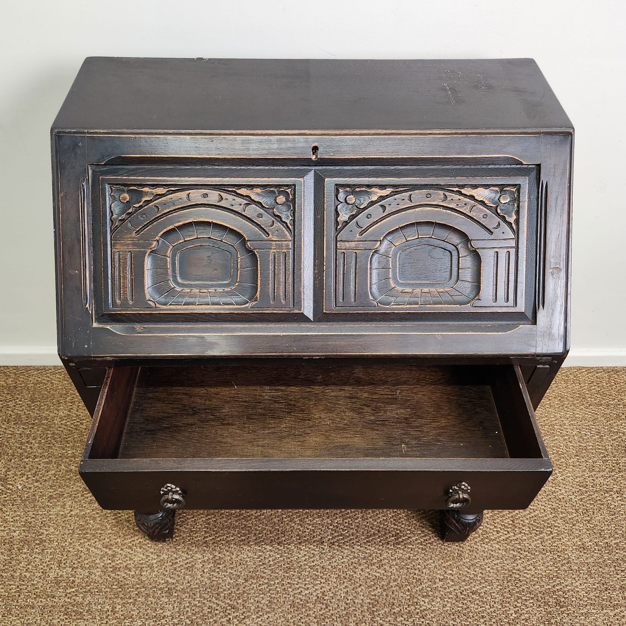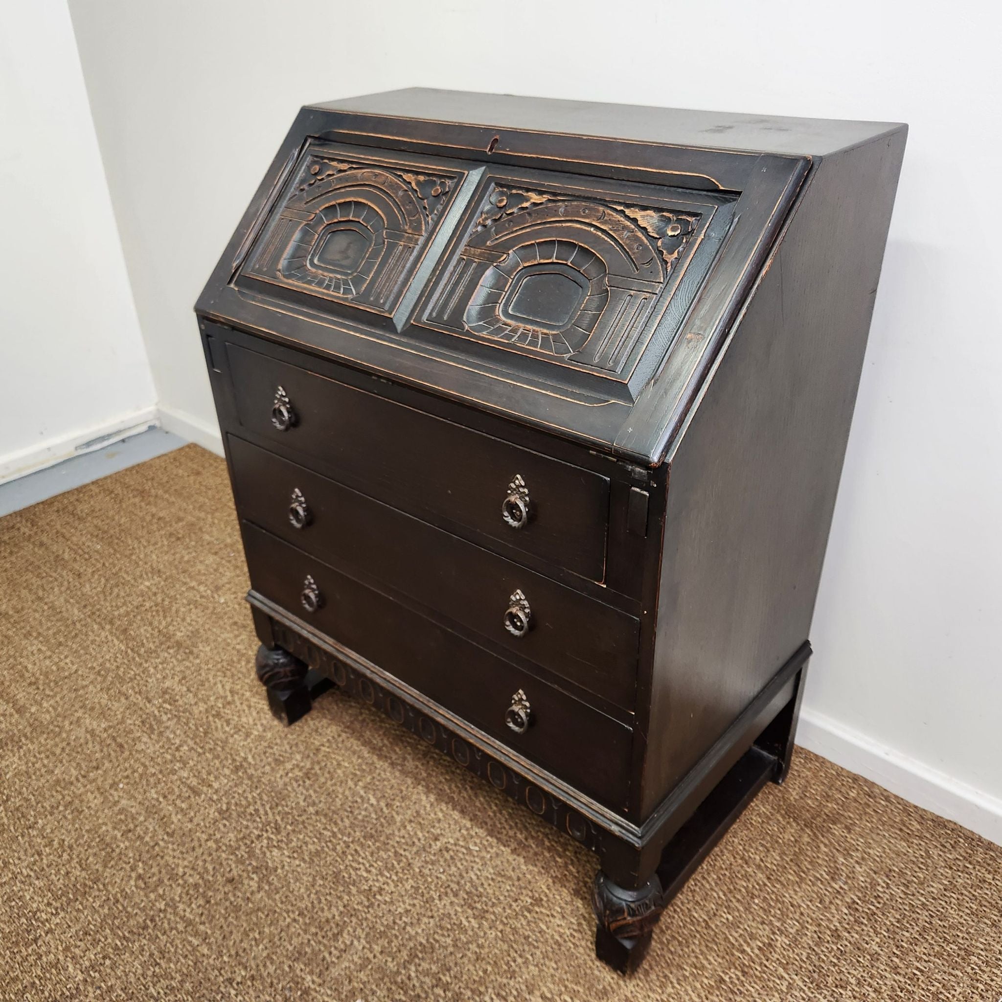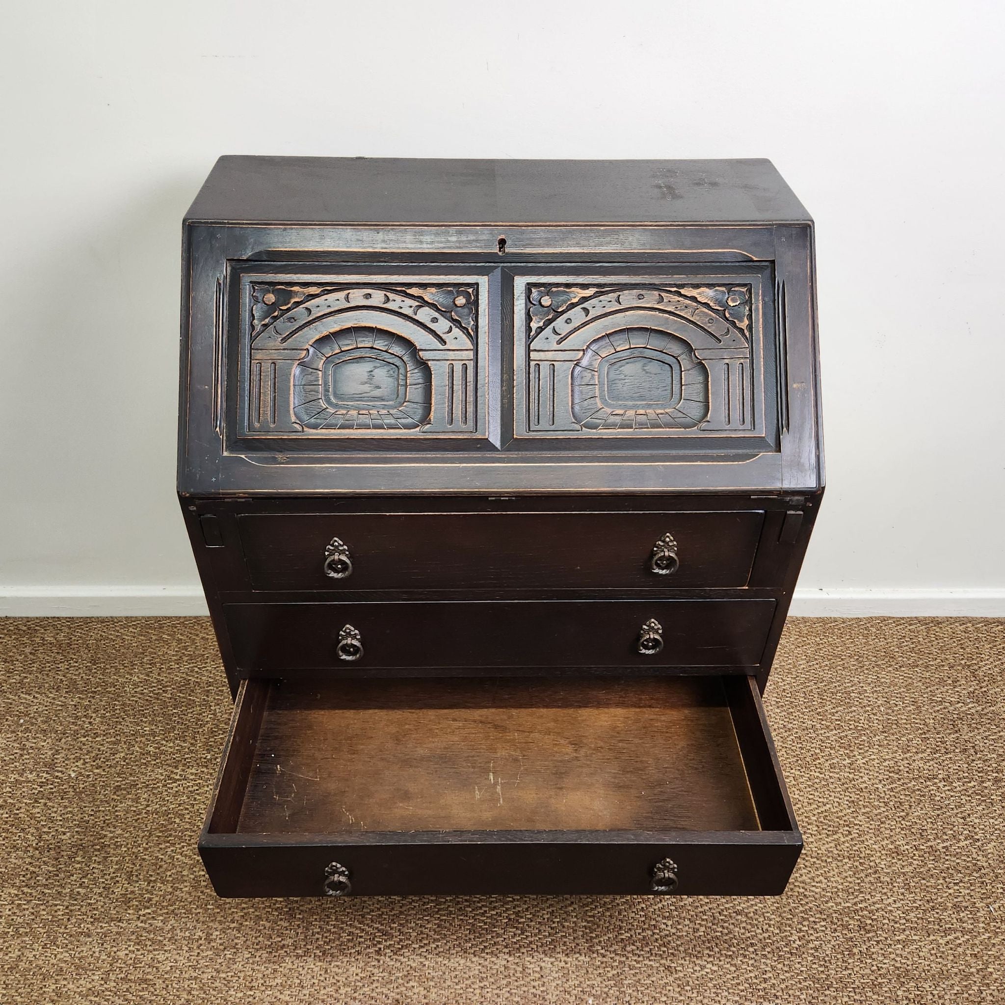This vintage oak drop down bureau has a fold‑down writing surface above three drawers, combining workspace and storage in a single piece.