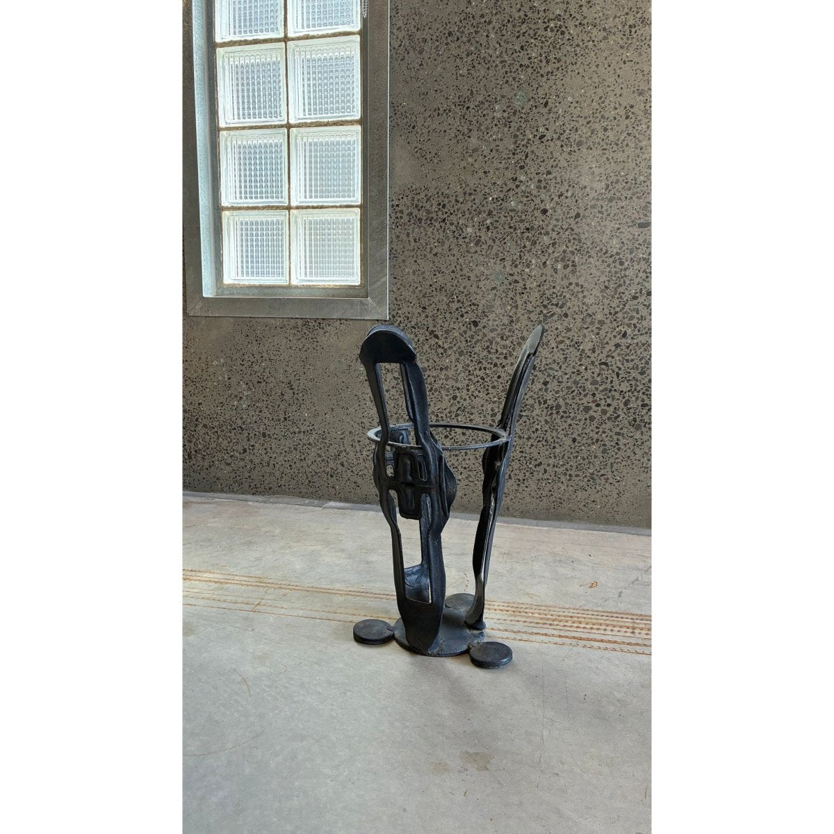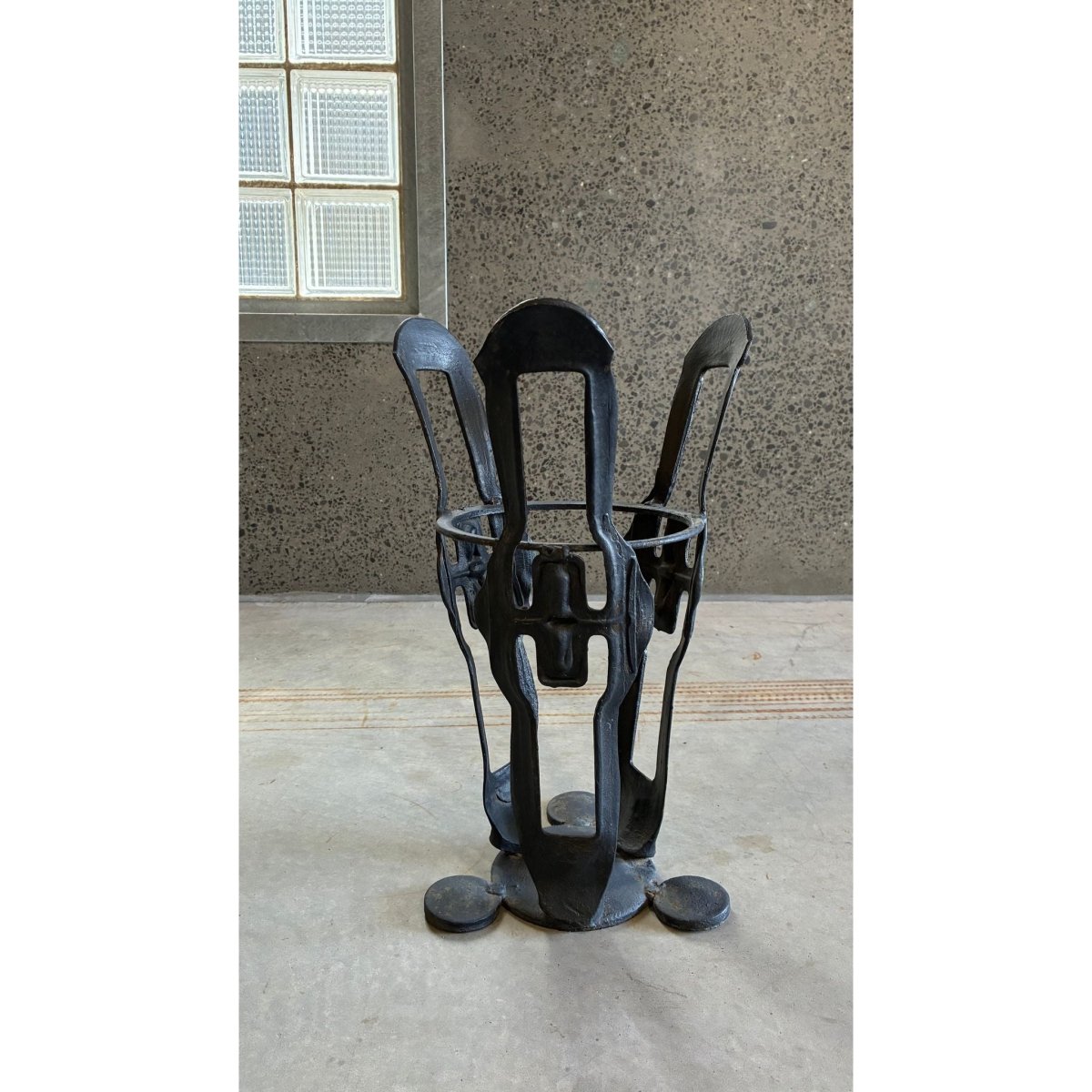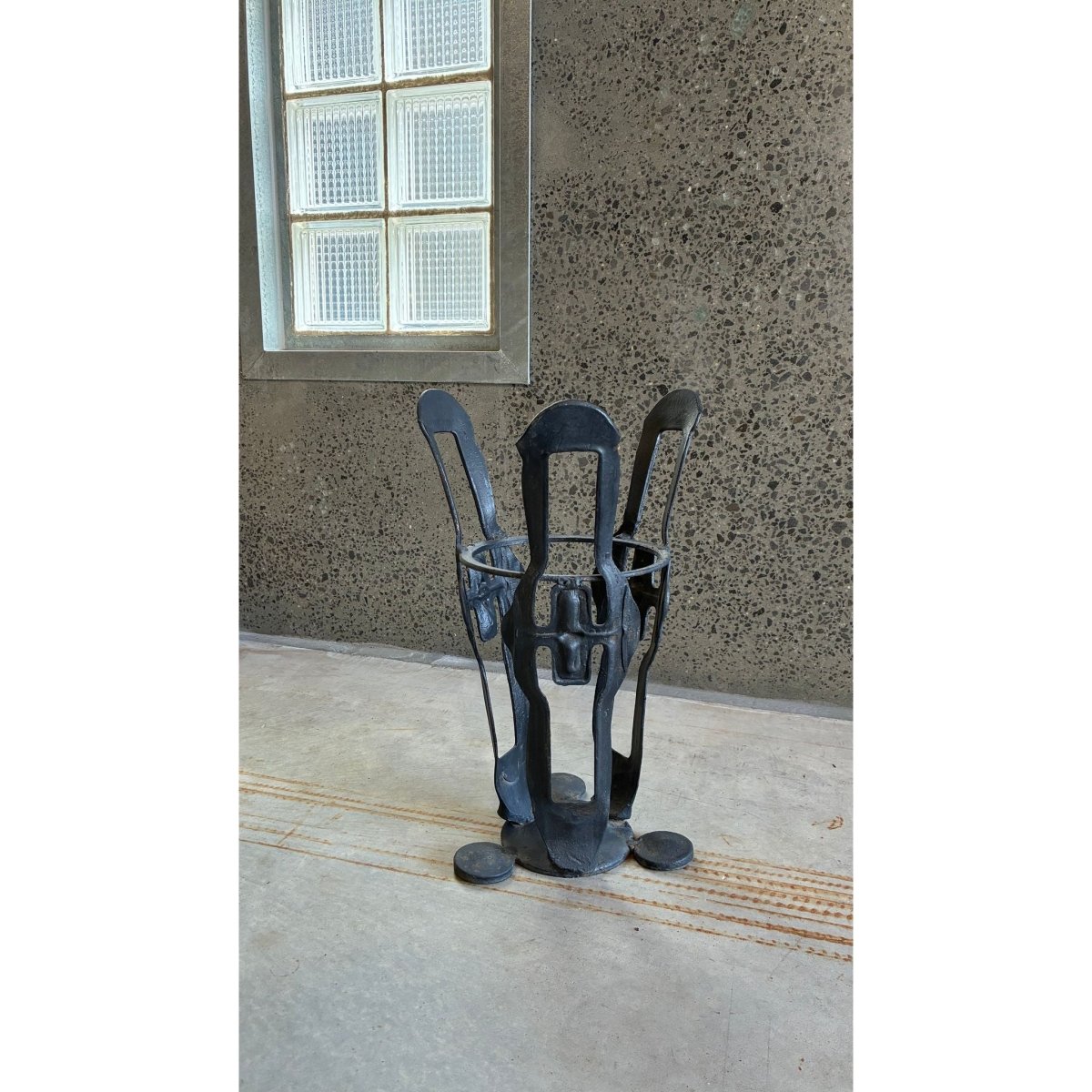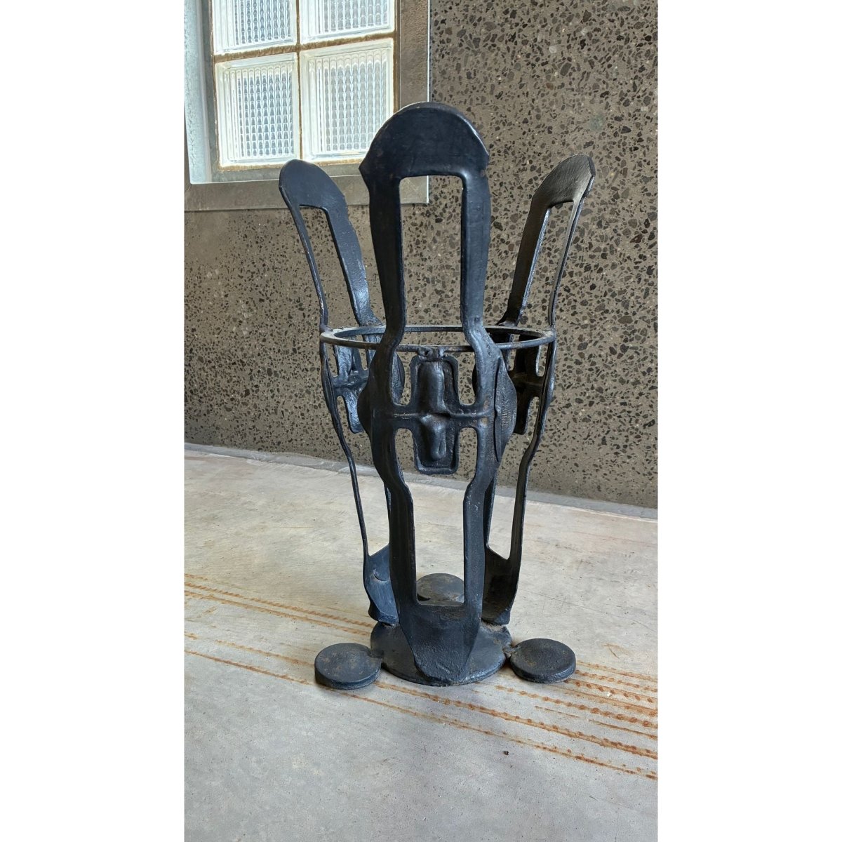 A sculptural wrought iron umbrella stand with an expressive form that reads as both utilitarian object and small-scale artwork.