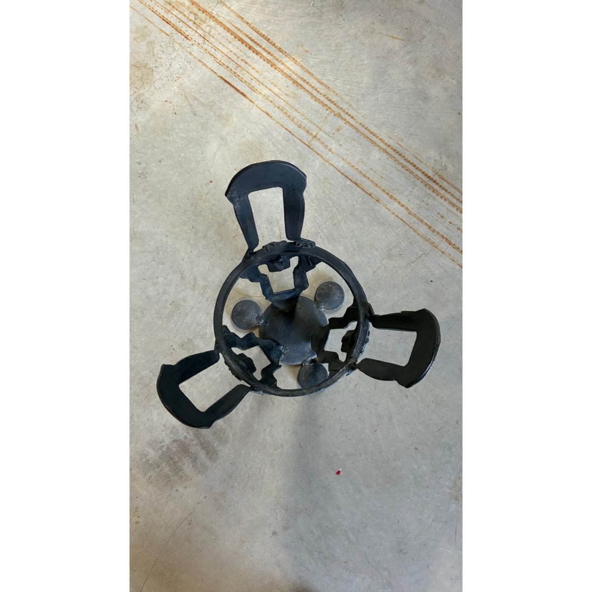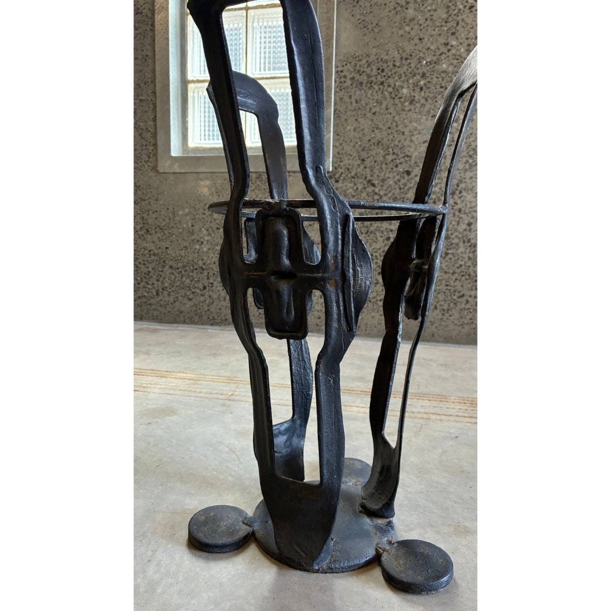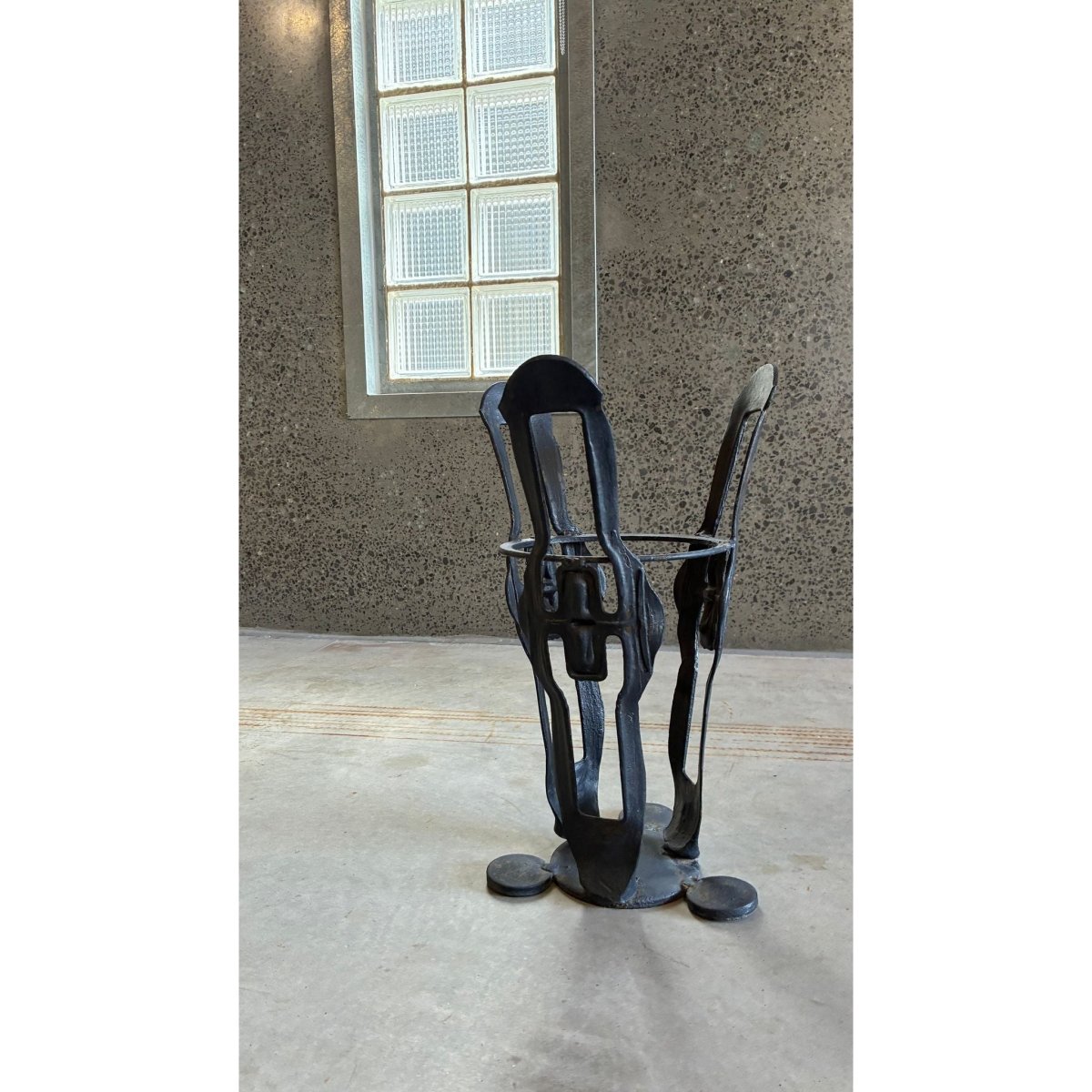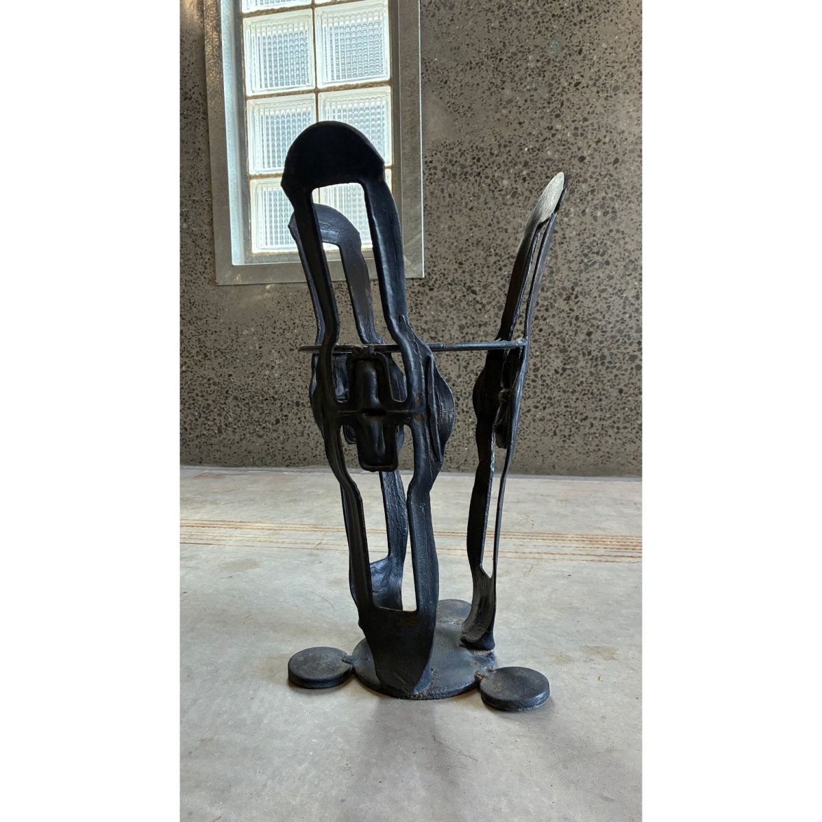 The iron has a dark matte patina with subtle surface variation and evidence of hard work, giving the piece a grounded, tactile presence. heavy and stable its sits confidently as a functional entryway object, yet its abstracted shapes and negative space lend to a modernist, almost totemic quality.